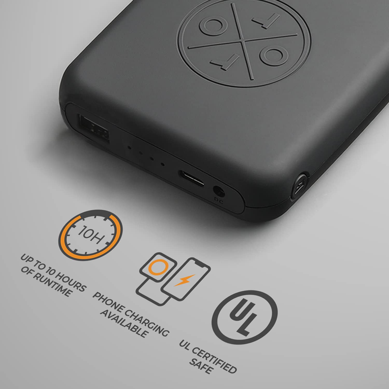 - Quick and Long-Lasting Warmth: Heats up in seconds and stays powered for up to 10 hours on a full charge. The 7.4V UL/CE certified battery also has a USB-A port for charging your smartphone or other mobile devices.