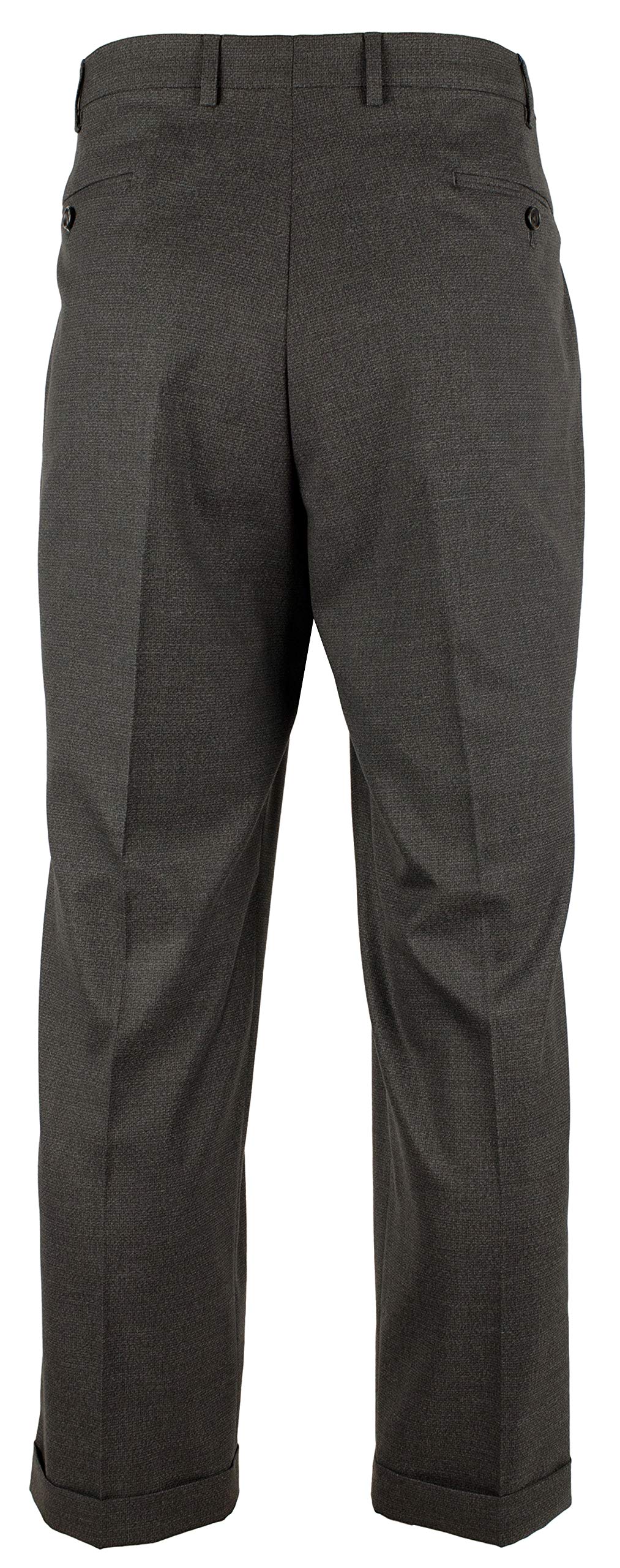Details: 88% polyester, 10% rayon, 2% spandex. Stretch fabric. Pleated with cuffed hem. Zip fly with button closure. Shirt gripper. Crease resistant. Comfort waistband. Side front and back pockets with button closure. Hang to dry. Machine wash with like colors.
