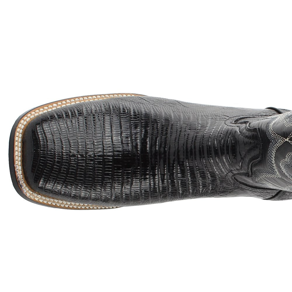 - SPECIFICATIONS - These men's western boots feature a square toe, Teju Lizard vamp, full-grain leather upper, leather outsole, and 1 3/4" block heel. The boots are available in whole and half-sizes in standard and wide width