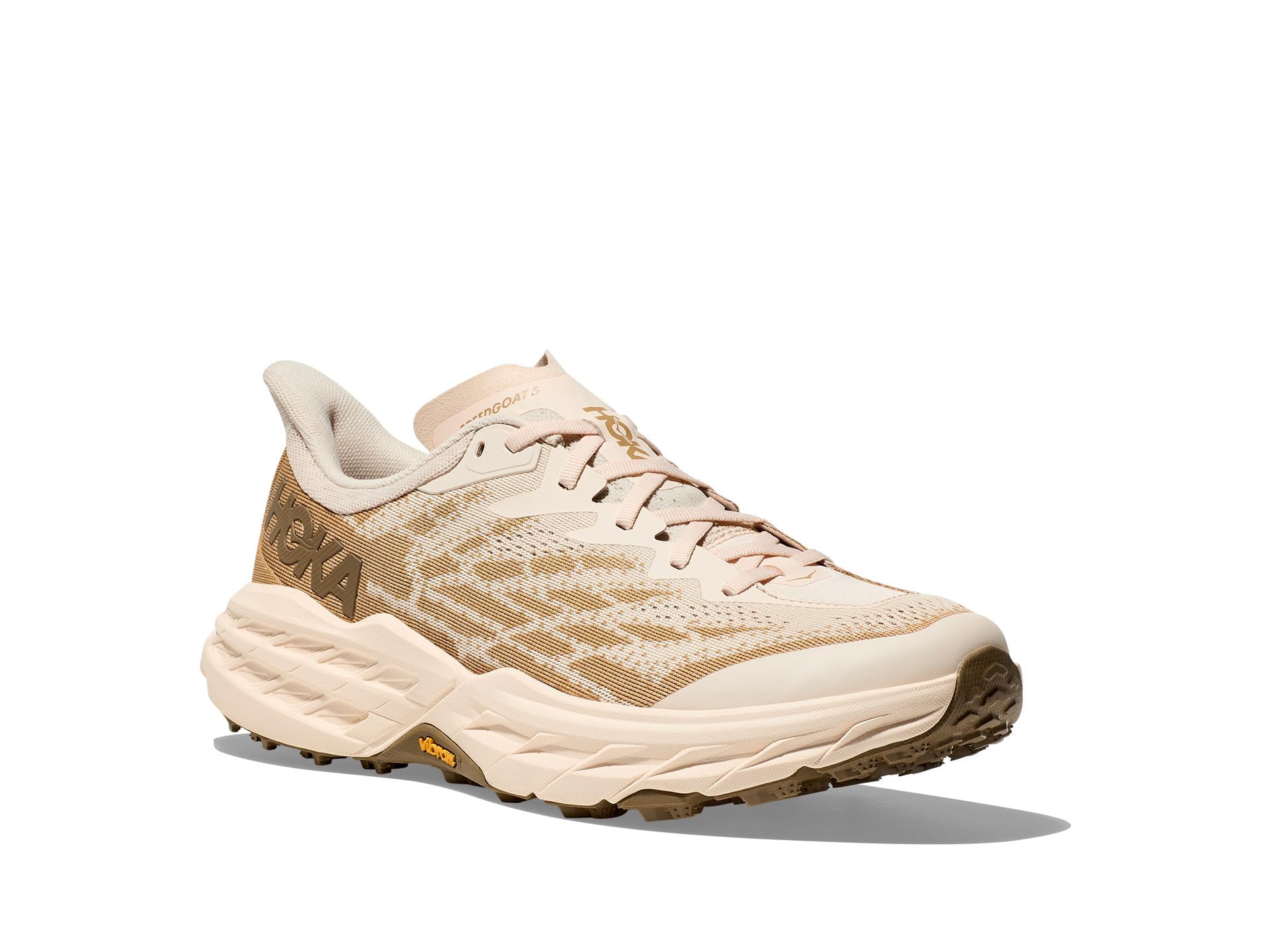 Speedgoat 5 silhouette Jacquard mesh upper Padded collar Protective toe rand HOKA branded tongue HOKA logo at lateral sides Late stage MetaRocker Flat woven laces Vibram Megagrip with Traction Lug Speedgoat branding on heel Rubber outsole Style: ho1123157-vlw Color: Vanilla / Wheat Material: Mesh