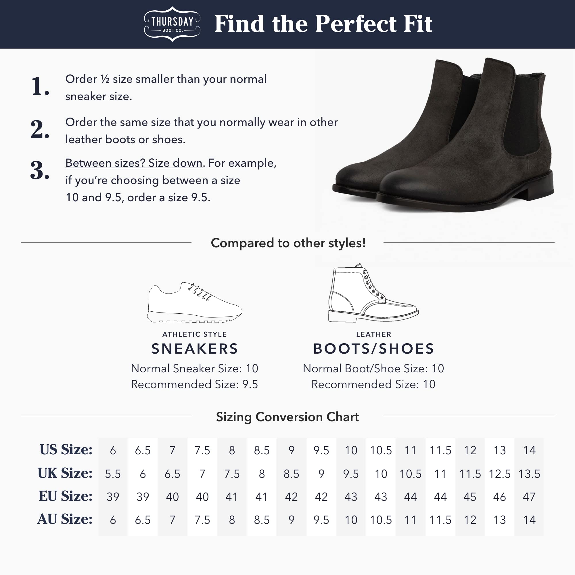 - THE PERFECT FIT - We recommend ordering the size you typically wear in leather boots or dress shoes, or ½ size smaller than you typically wear in sneakers. If you have any questions, need help finding your size, or need to exchange for a different size, our team is always here to help!