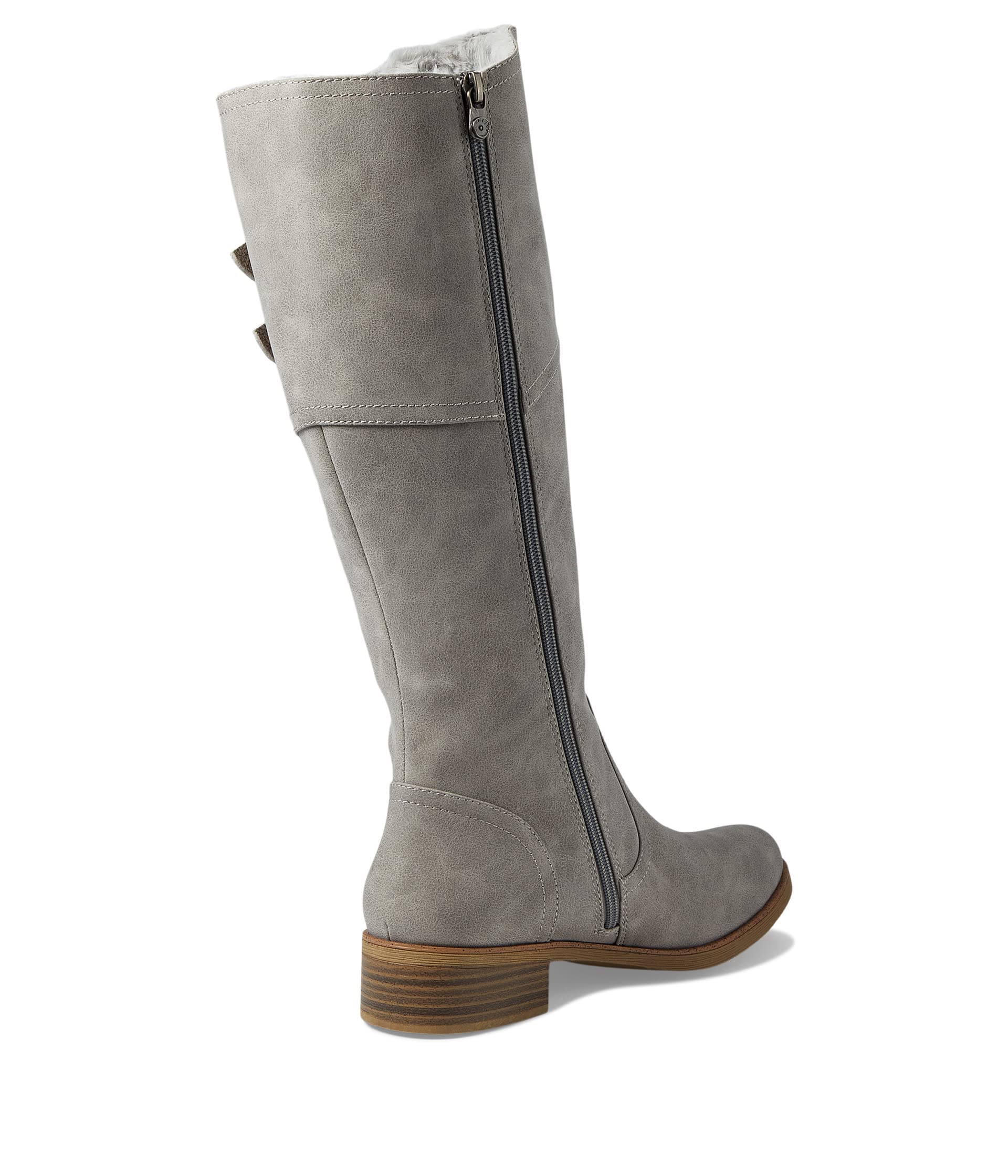 Casual boot from Blowfish Malibu Faux leather upper with buckle details Knee-high design Zip closure Cushioned footbed 1-1/2" block heel