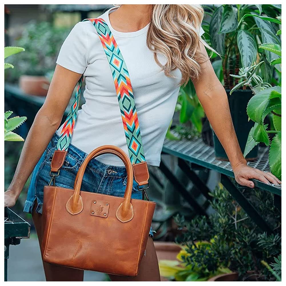Details: Head out for the day with adequate space in the STS Ranchwear™ Basic Bliss Satchel. Made of genuine leather with cotton lining. Carry by the dual top handles or removable strap. Includes two detachable crossbody straps; one made of leather while the other features textile webbing construction and leather detail and an allover southwestern design. Open compartment satchel without top closure. Zippered pocket featured in middle compartment as well as an interior back wall zip-pocket. Two interior elastic top pouches on the front wall. Imported. Measurements: Bottom Width: 11 in Depth: 5 in Height: 9 in Strap Length: 48 in Strap Drop: 24 in Weight: 2 lbs 8 oz
