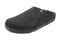 Men's navy Birkenstock Zermatt slip-on mules with soft felt textile upper featuring metal logo stud. and contrasting tan contoured footbed. These closed-toe slippers have a textile insole. and lightweight EVA dark grey sole.