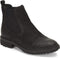 Waterproof suede leather upper Ankle-high Chelsea boot shaft Closed round toe and back with top looped heel tab Slip-on styling with twin stretch gored side panels Cushioned footbed Lug outsole 1-1/2" stacked heel