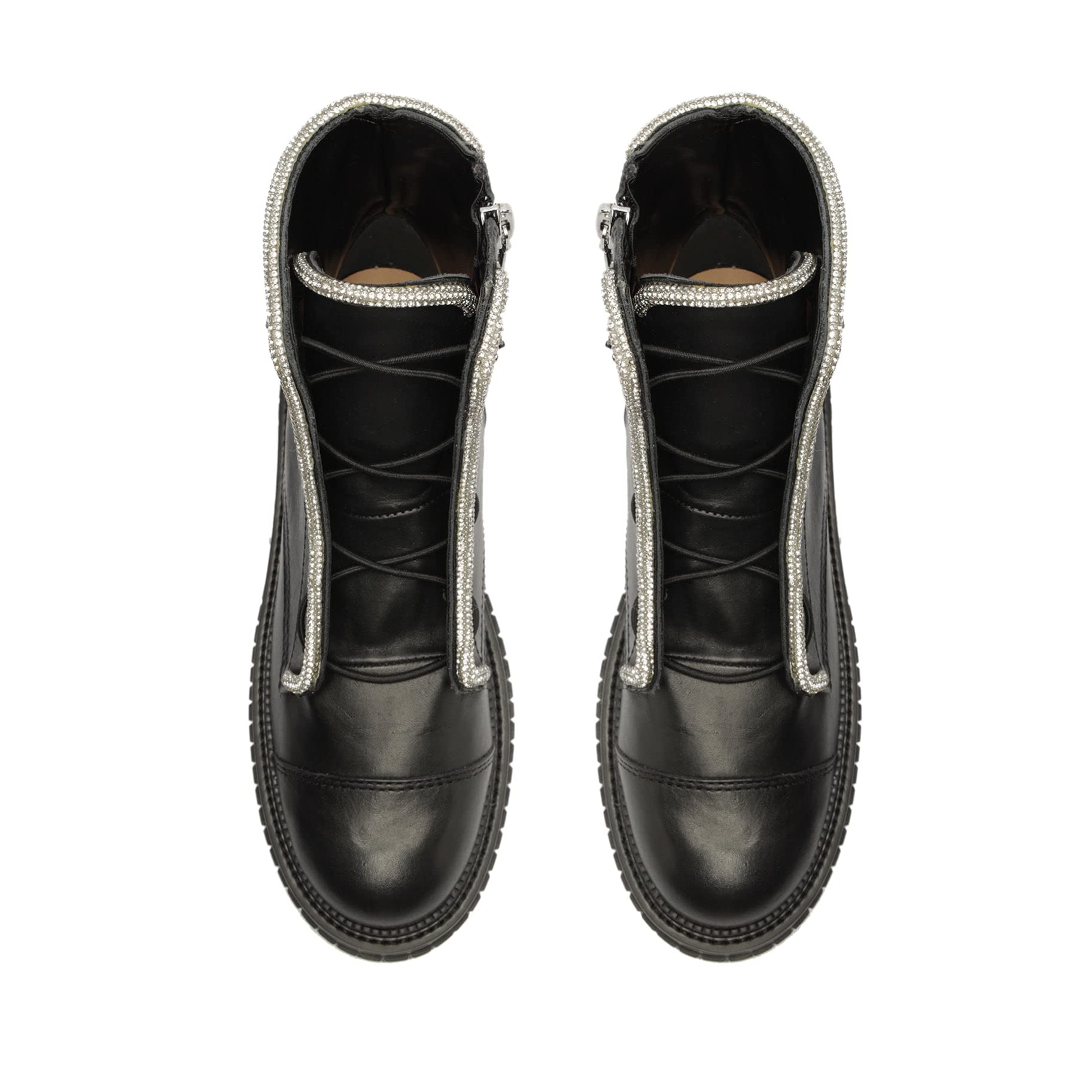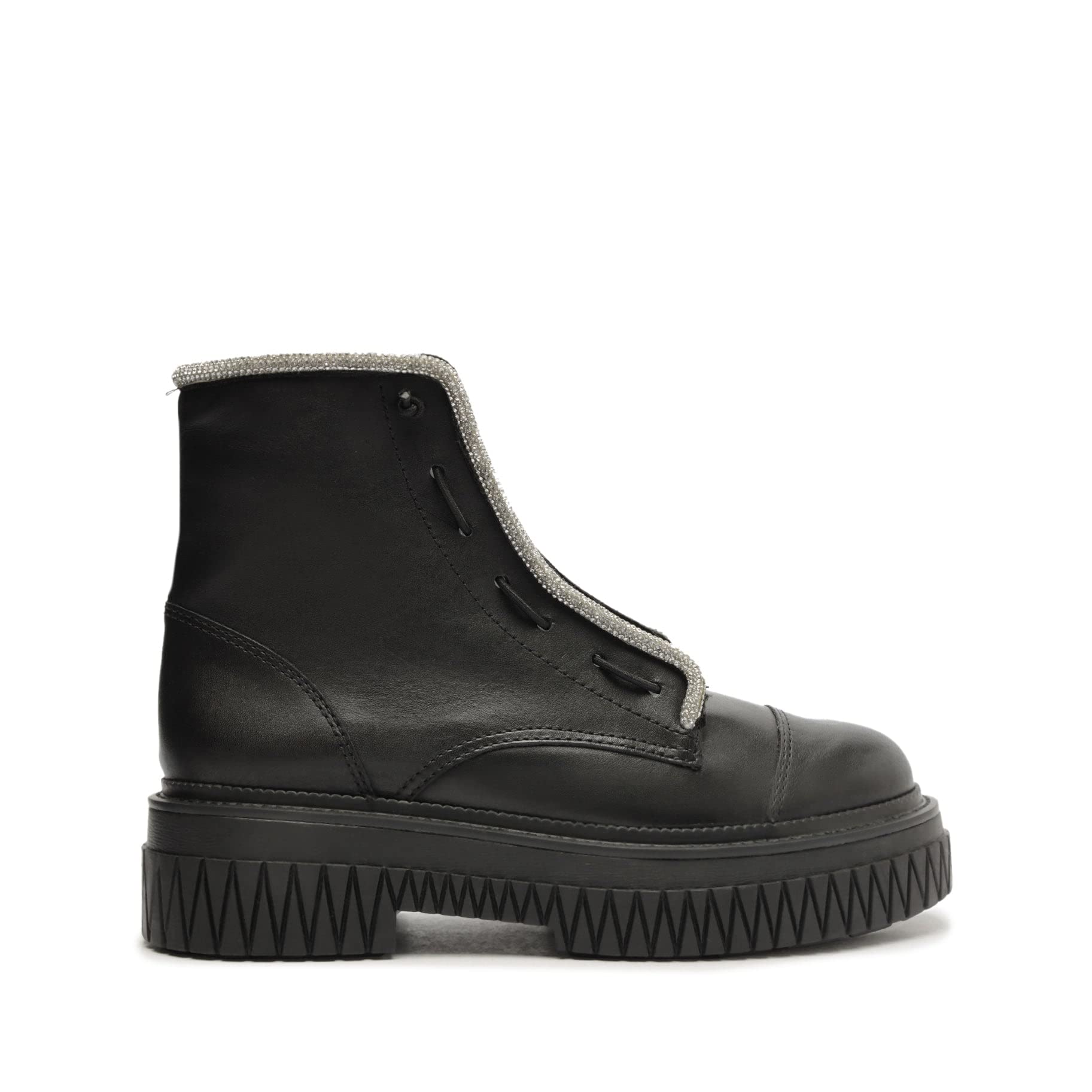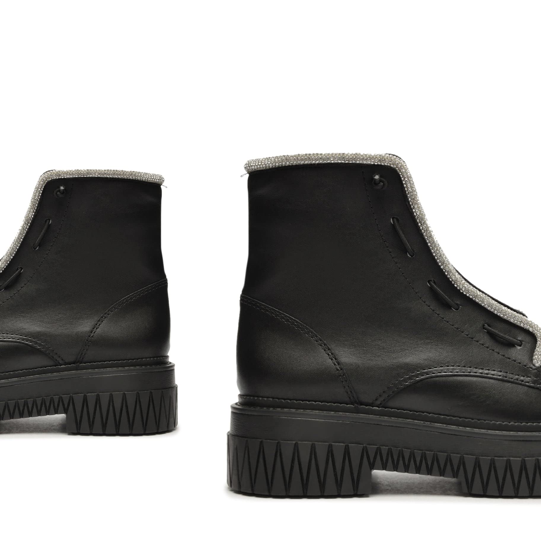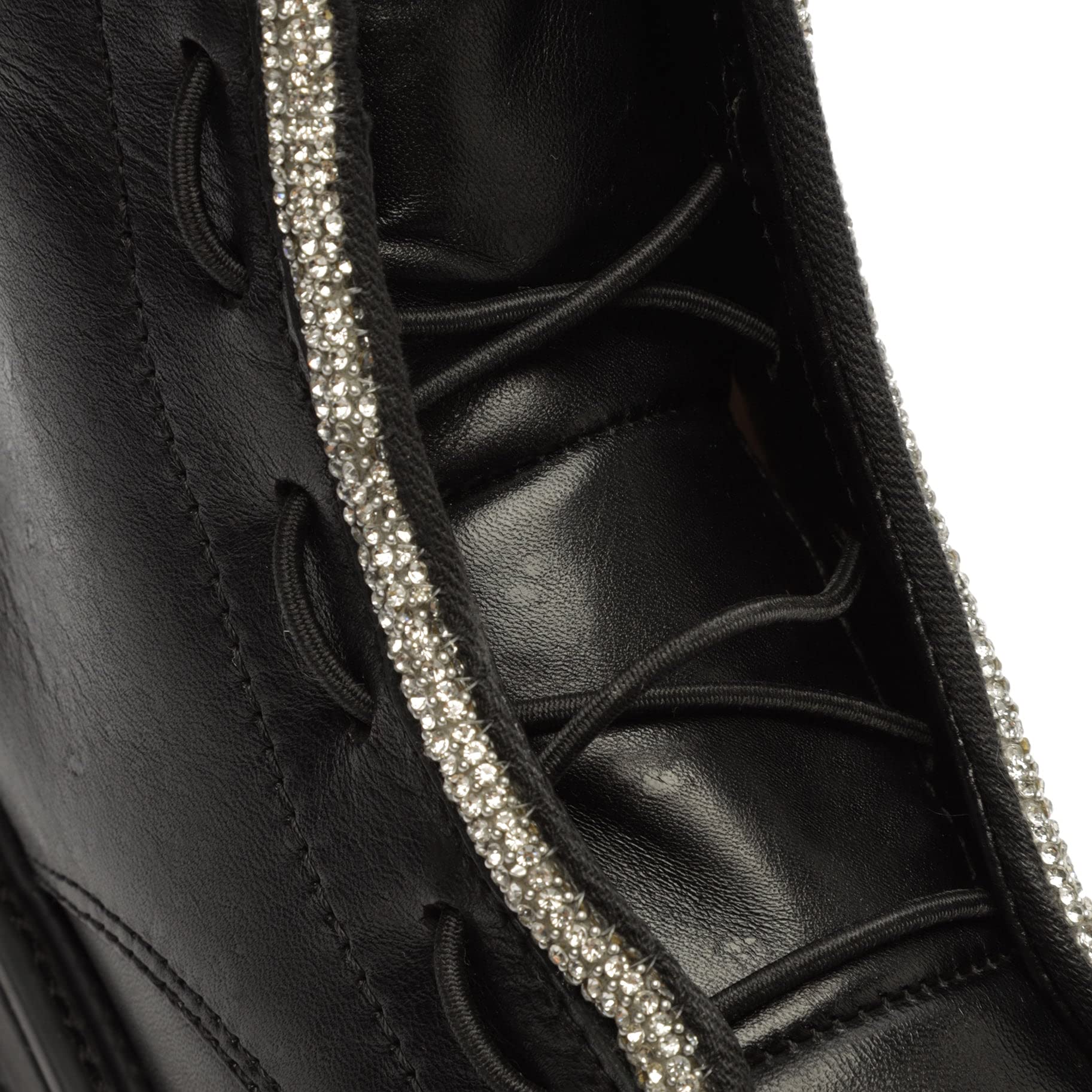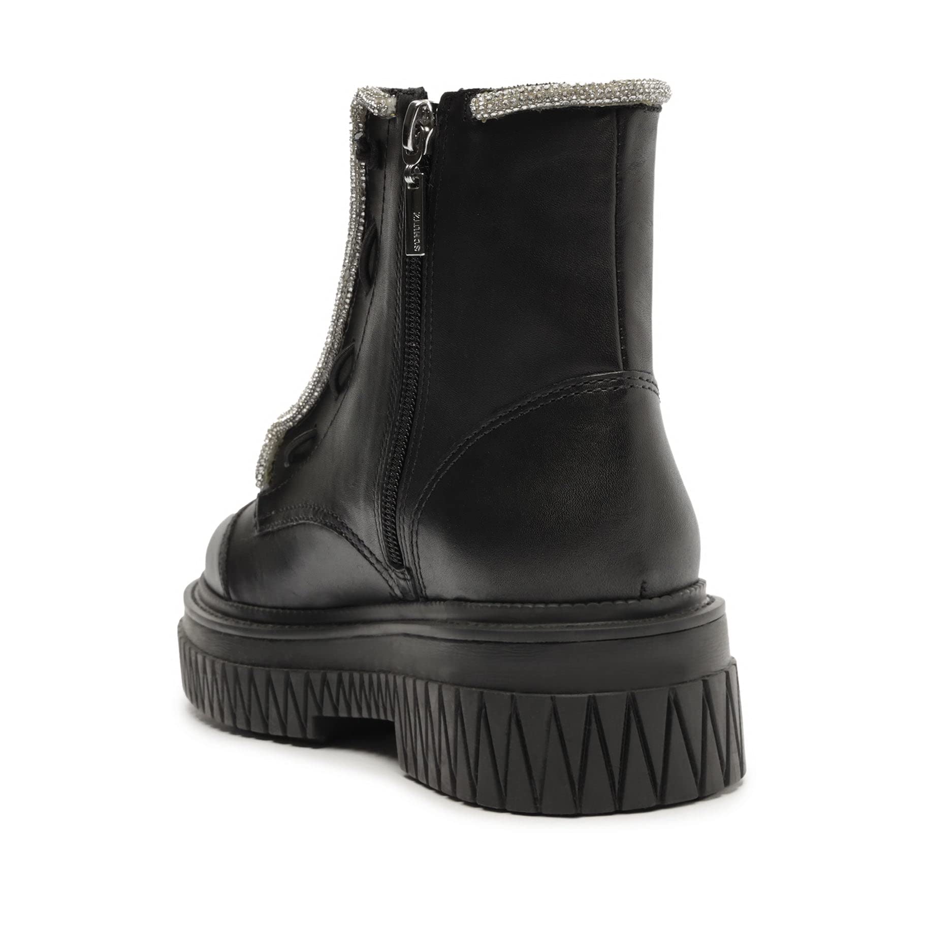 Classic combat boots get an unexpected makeover, courtesy of Schutz. This pair is distinguished by decorative laces, as well as crystalline trim that traces the seams.