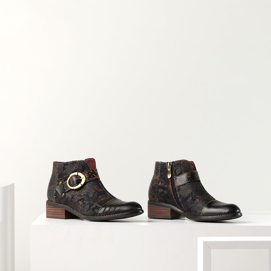 French-inspired bootie with hand-painted leather and metallic printed microsuede featuring its decorative buckle strap and vibrant rainbow stitching. Almond toe, premium leather combo, antiqued metal hardware. Full length inside zipper closure with brushed metal zipper pull. Soft and cozy monochromatic paisley textile lining. Comfort padded synthetic leather insole.