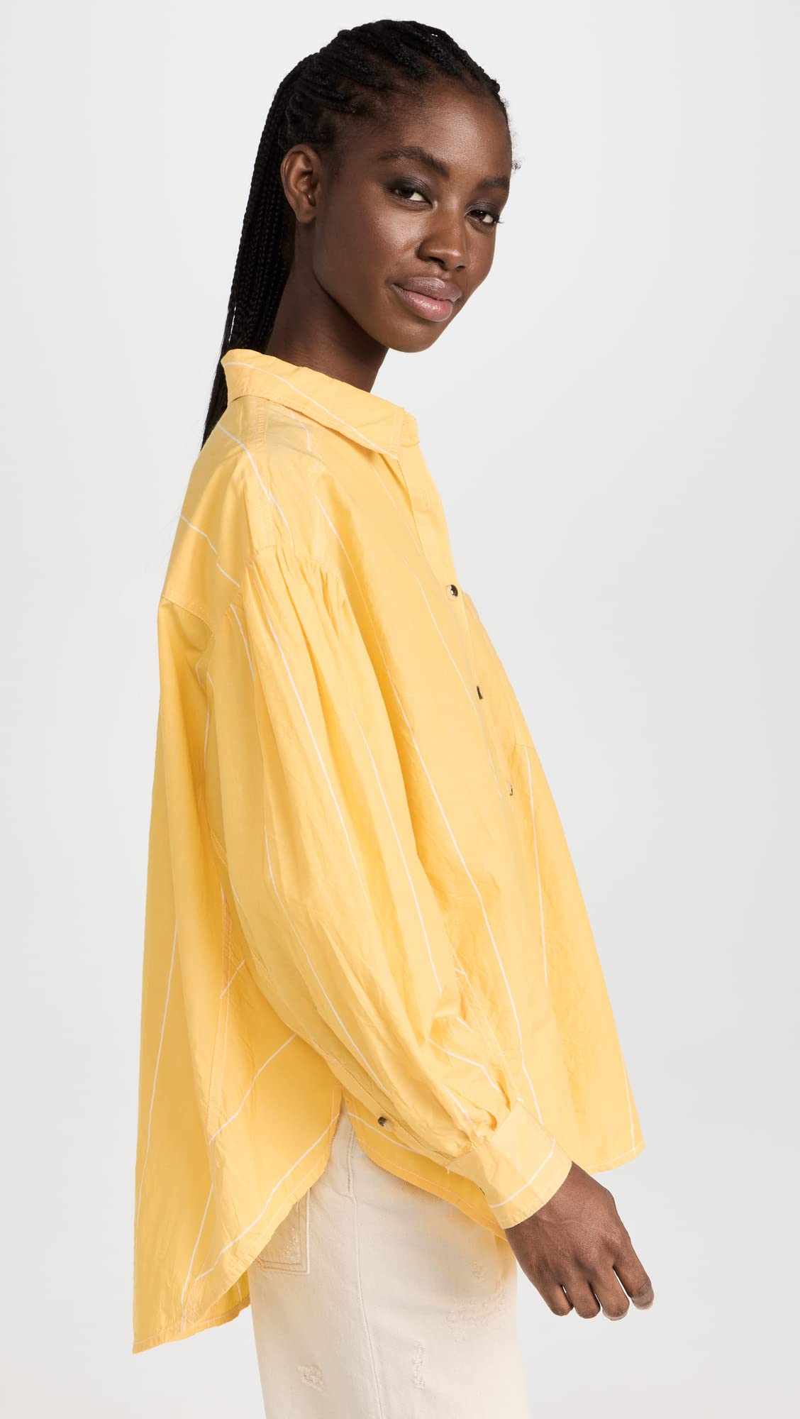 Sparse stripes and slouchy proportions distinguish this crisp and warmly colored Free People button down shirt. Complement yours with a pair of light wash jeans.
