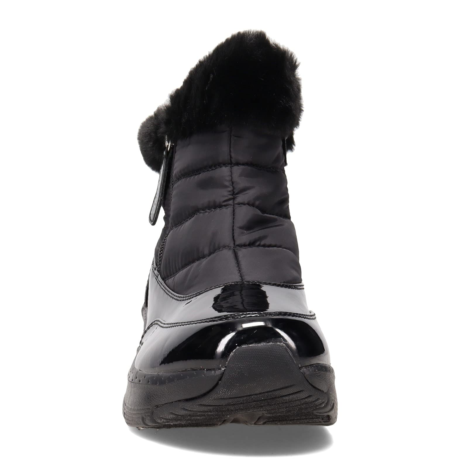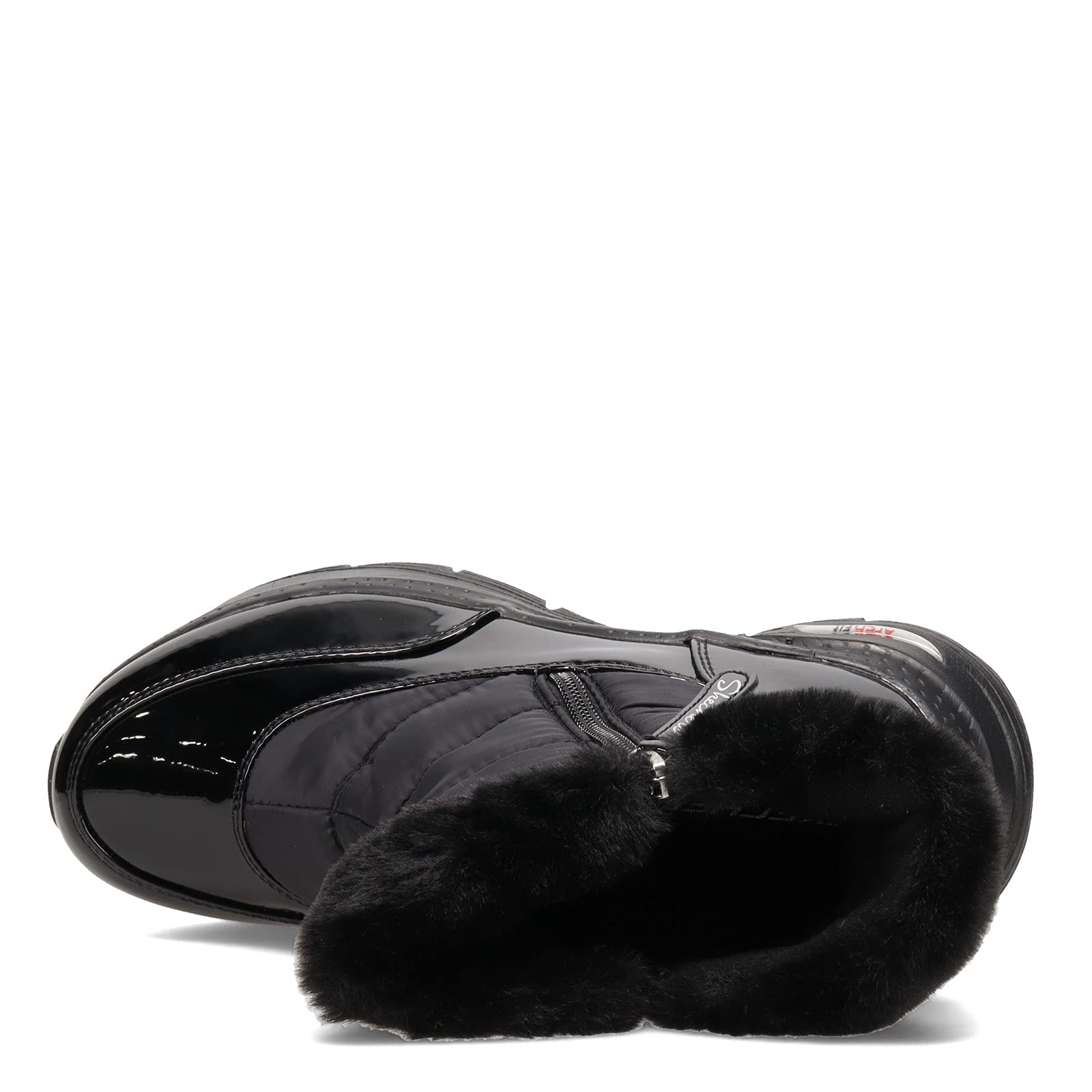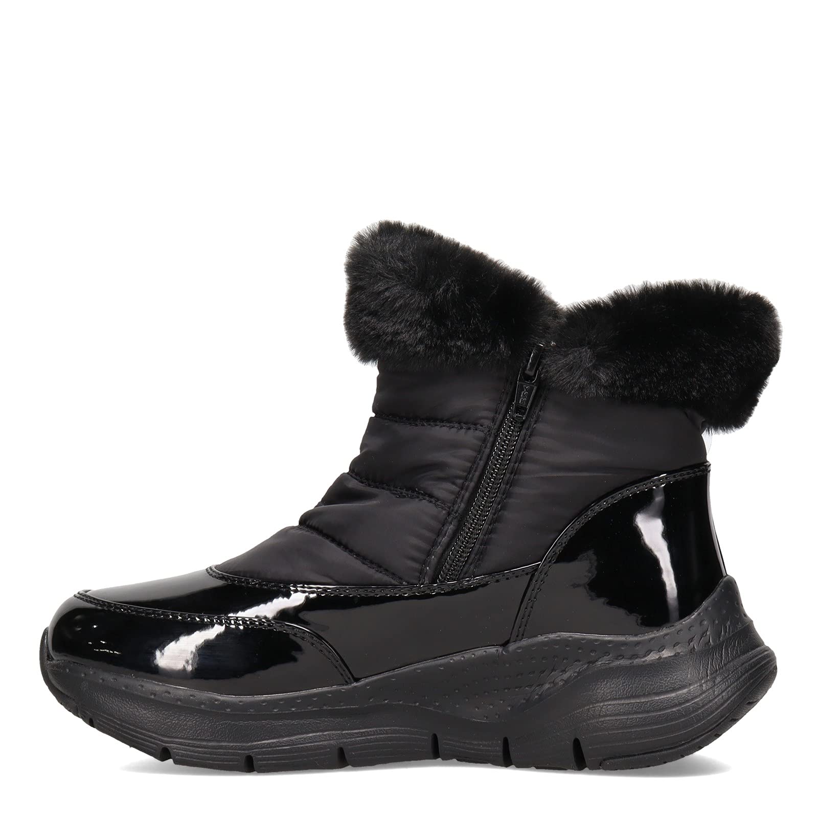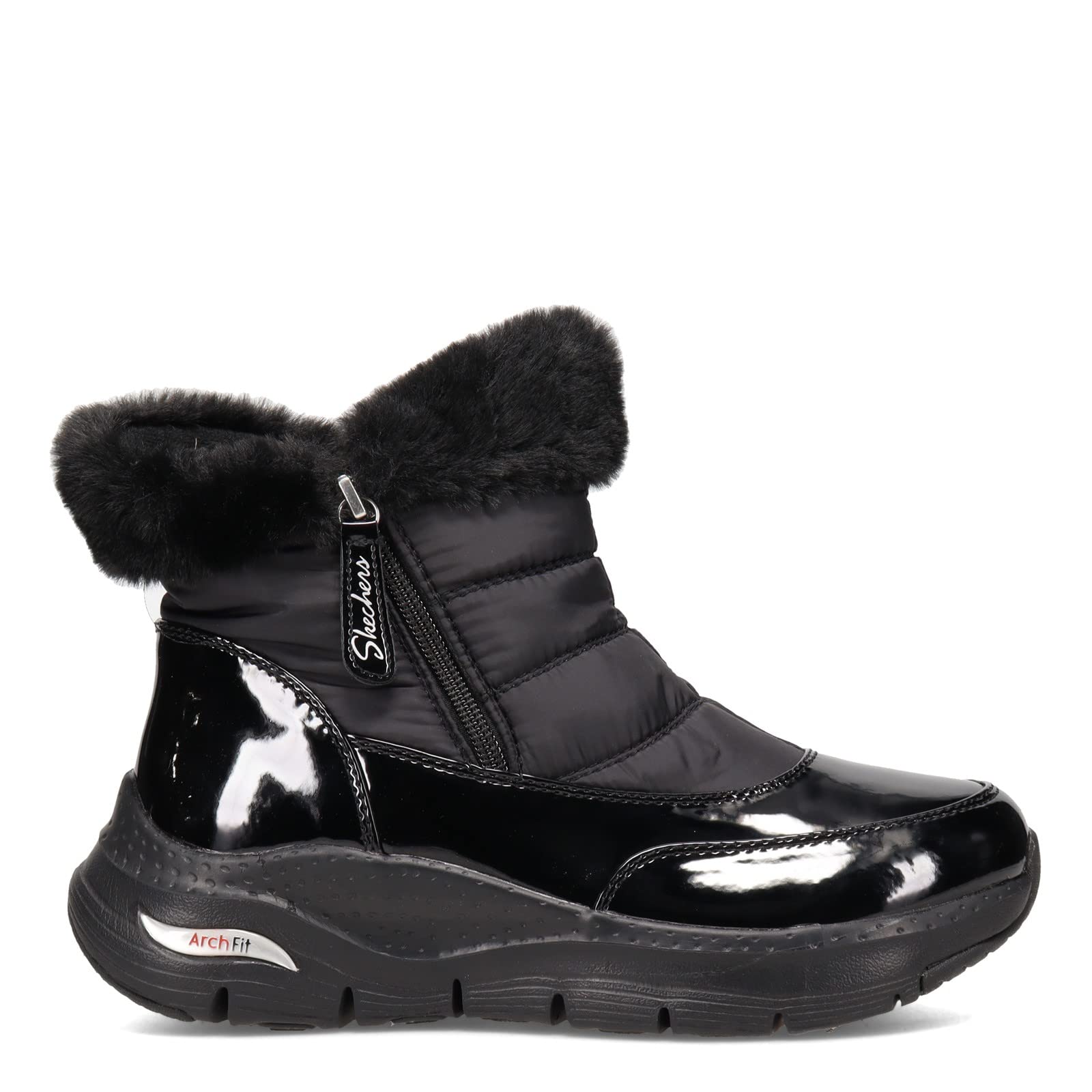 Details: Women's Skechers, Arch Fit - Cool Puff Boot. This cute boot is just what you need to stay warm and cozy during cold weather days. It features an upper with a faux-fur trim and lining that keeps you comfortable all day long, and a water-repellent design that provides extra protection from the elements. Synthetic patent and quilted nylon fabric upper is water-repellant Soft faux fur collar trim and full liningEasy to wear side zip closure Removable insole with Podiatrist-designed shape developed with 20 years of data and 120,000 unweighted foot scansLightweight cushioned midsole with flexible rubber traction outsole