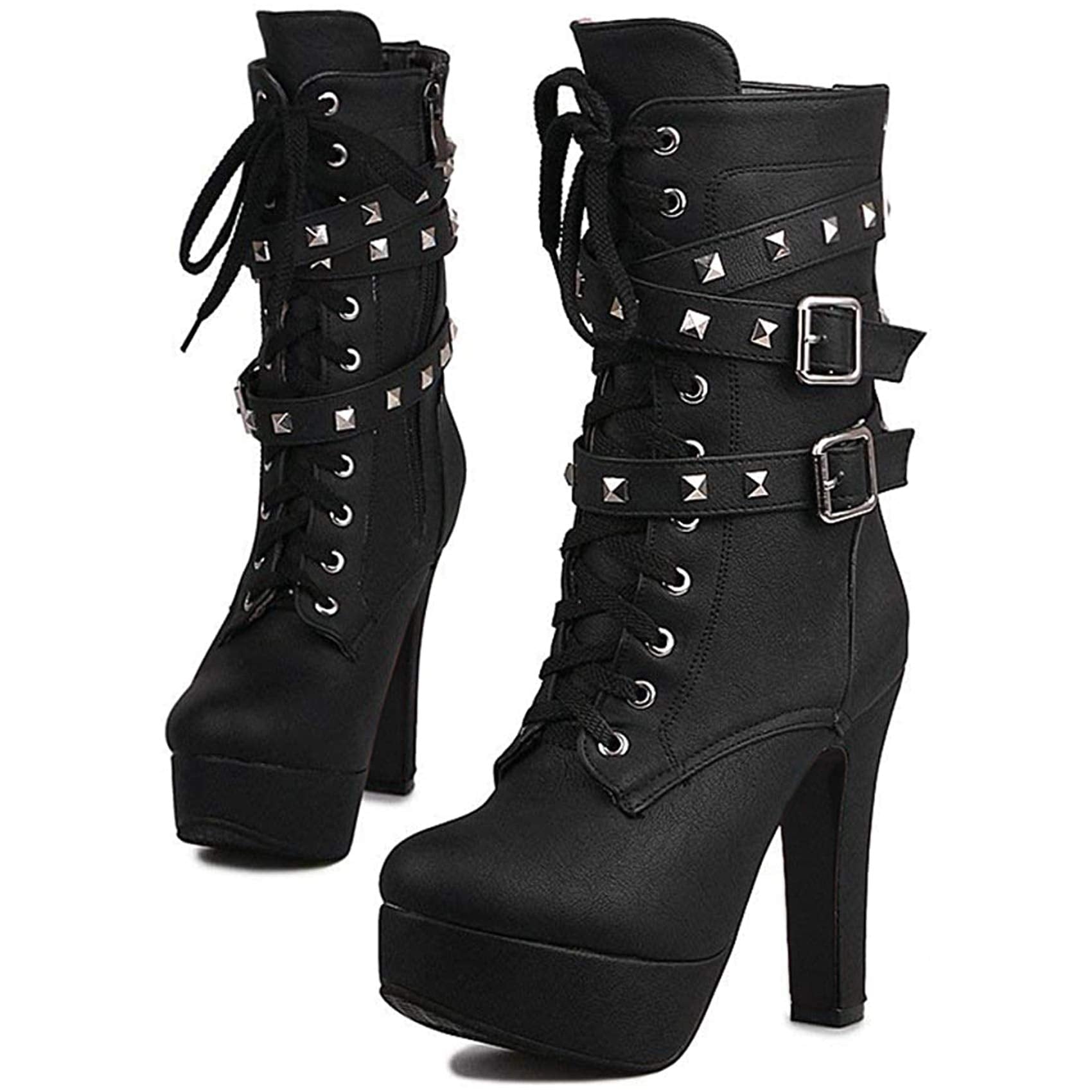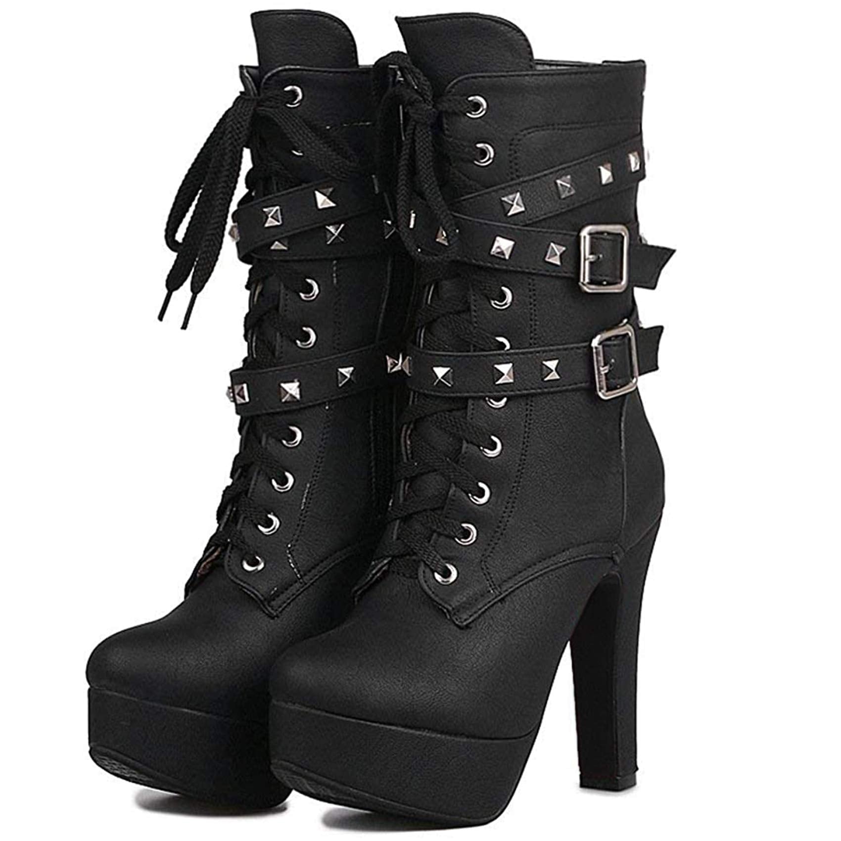 Women Autumn Round Toe Lace Up Ankle Buckle Chunky High Heel Platform Knight Boots (Black2, numeric_5_point_5)…