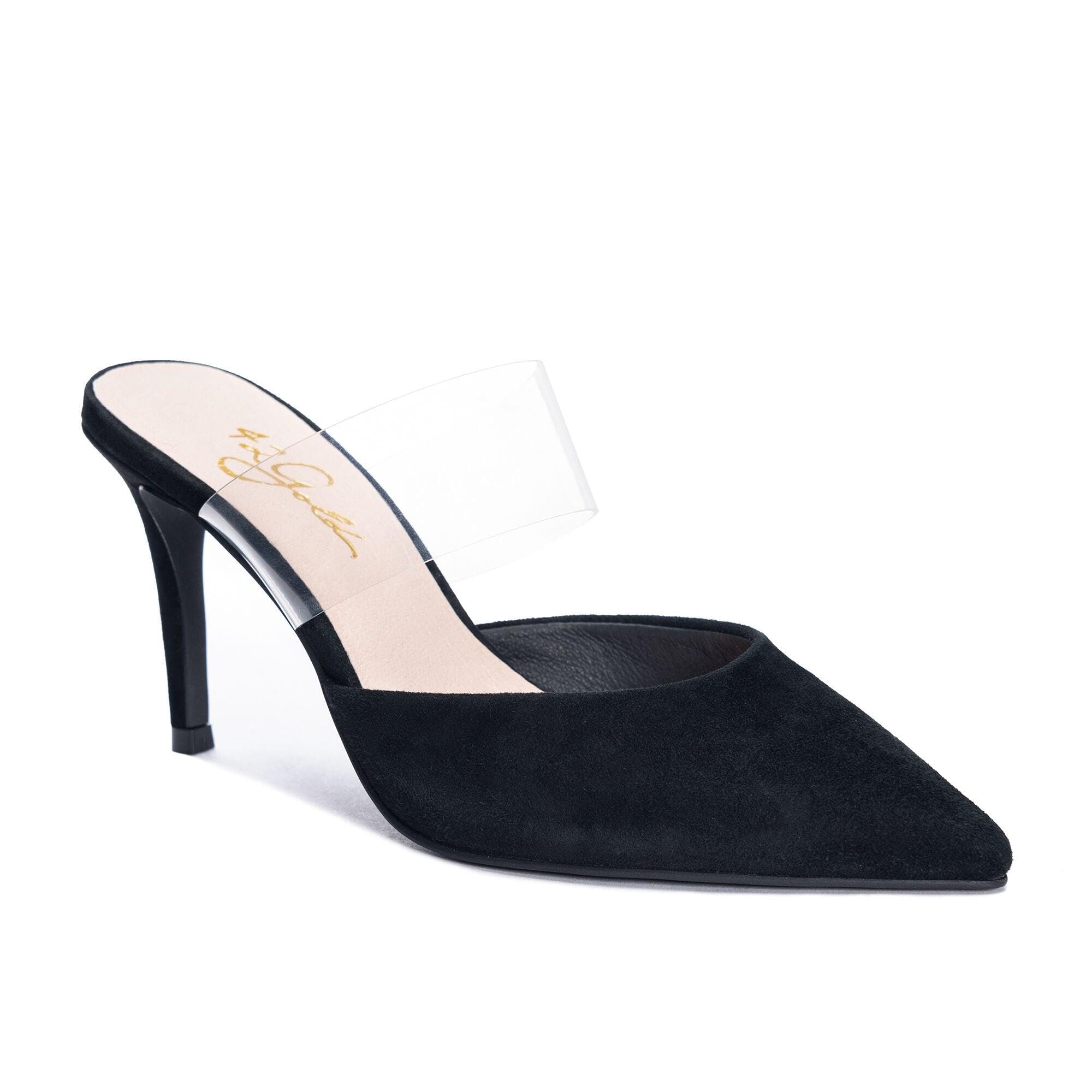 A pointed-toe suede stilleto mule with a second, transparent vamp for both elevated style and comfort. The Ronnie Pump is the clear choice to kick things up a notch, no matter the occasion. By 42 Gold. Leather, Suede & Manmade Materials 3.5" Heel