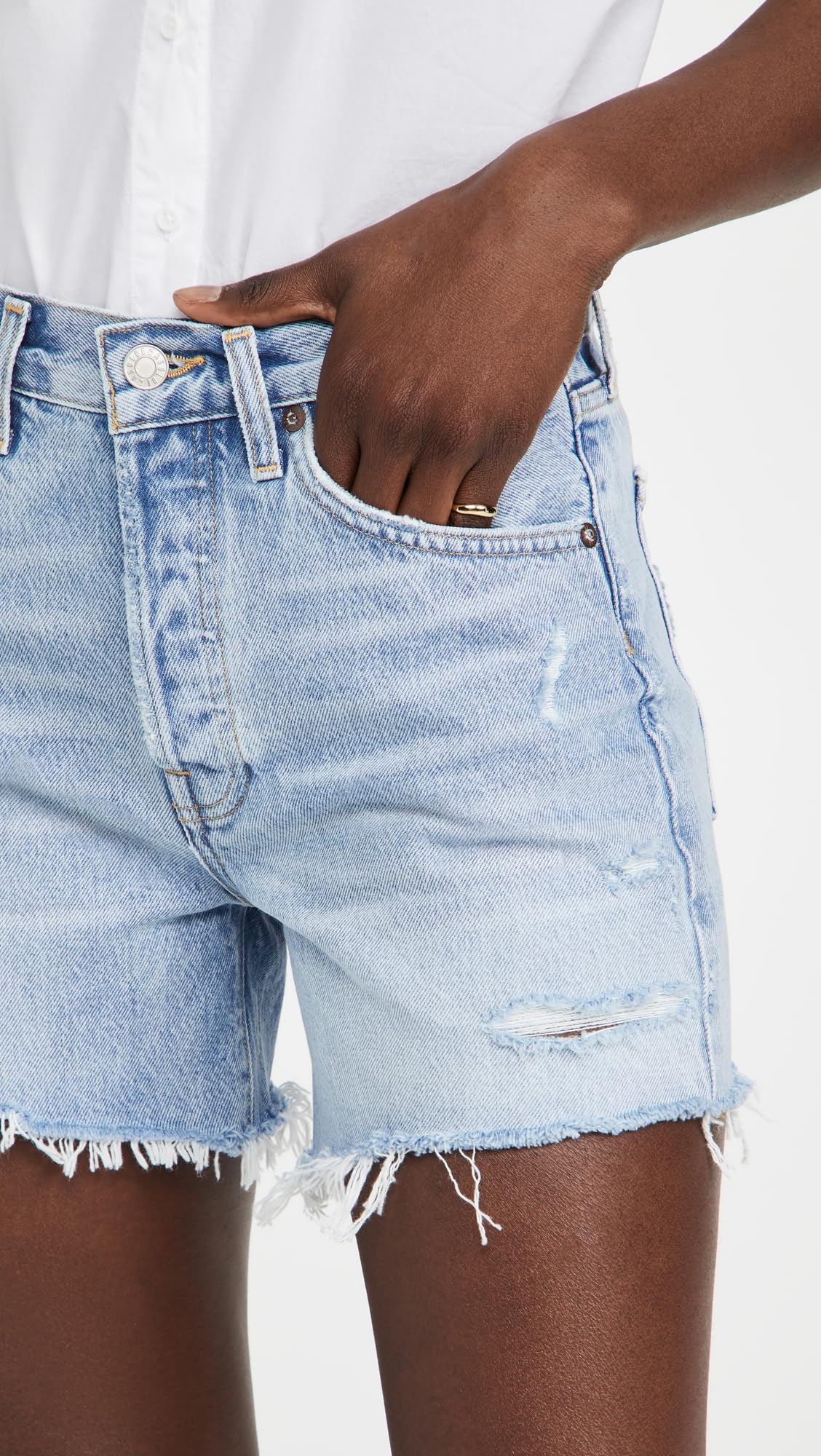 - Light distressing, Fading and whiskering, Frayed, raw hem