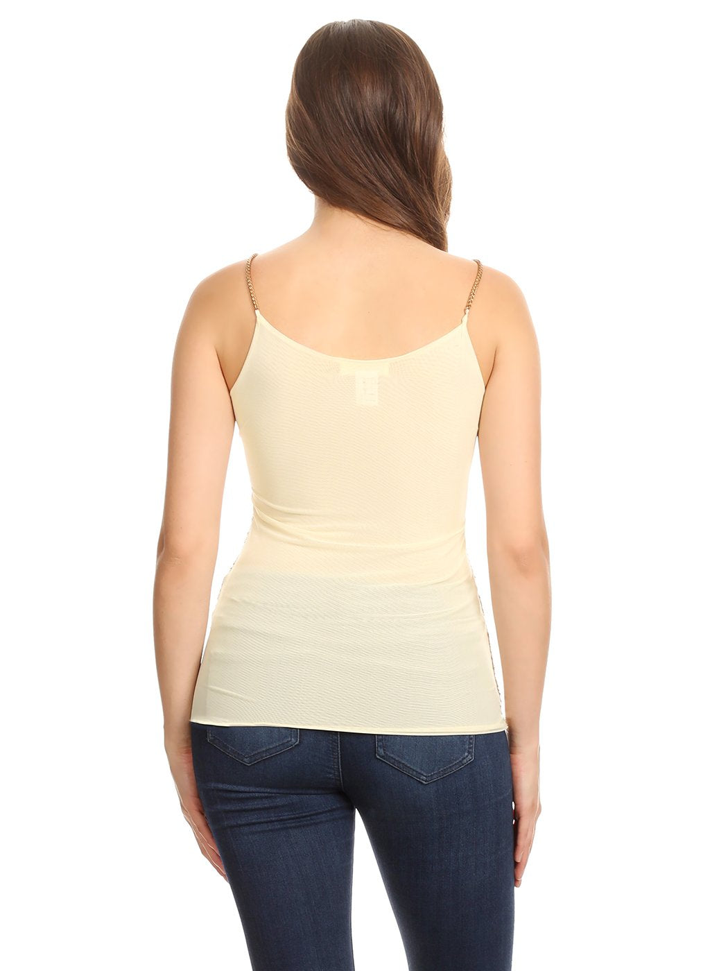 - GLITZY SEQUIN CAMISOLE STYLE TANK TOP. A unique scoop neck tank top embellished with shiny metallic colored sequins complimented by rope chain straps.