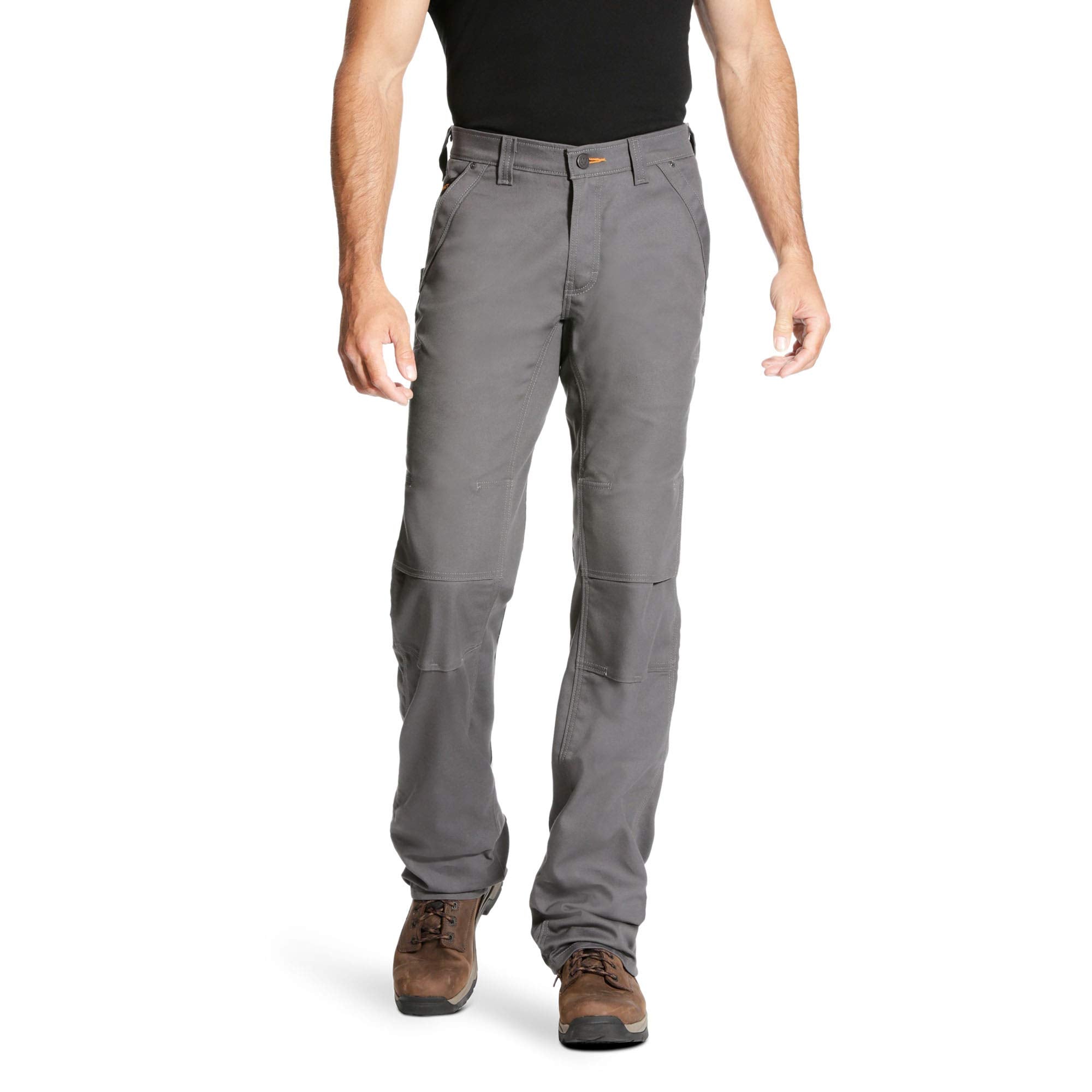 Rebar M4 Low Rise DuraStretch Made Tough Double Front Stackable Straight Leg Pant Rebarâ„ Made Tough DuraStretch Work Pants deliver strength minus the stiffness or bulk. Built-in stretch provides exceptional comfort and mobility. For our double front style, a reinforced thigh chap and triple-needle stitching add extra durability. 9 oz DuraStretch canvas Utility pocket and pen slot Carabiner loop Thigh chap for reinforcement Articulated knee with knee pad compatibility Triple needle stitching at stress points 99% cotton, 1% spandex.