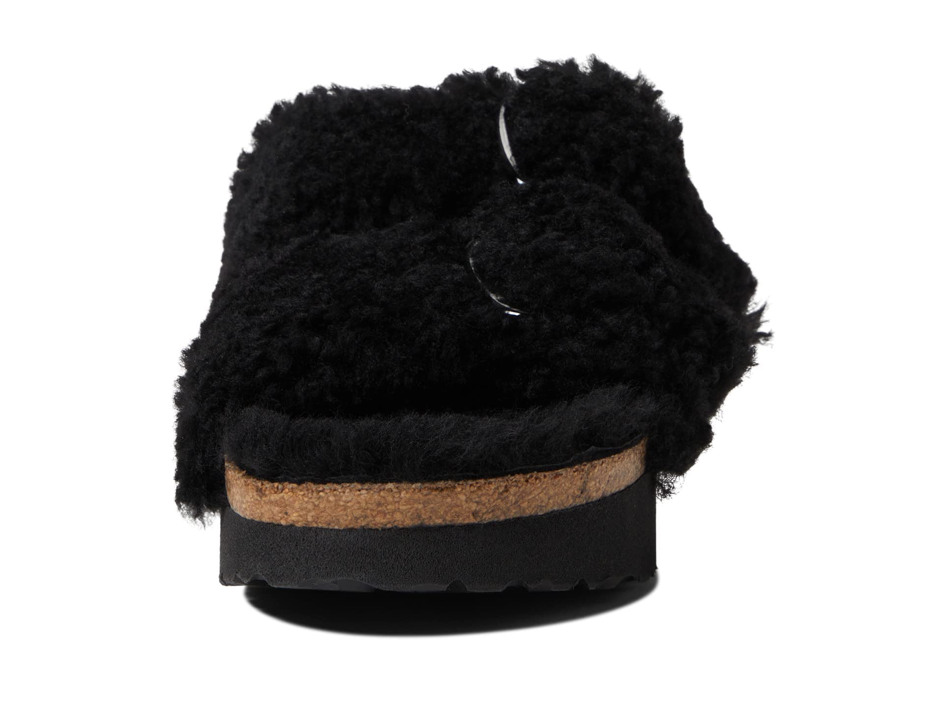 - Cork midsole, Shearling lined footbed , Adjustable buckle straps, Narrow width