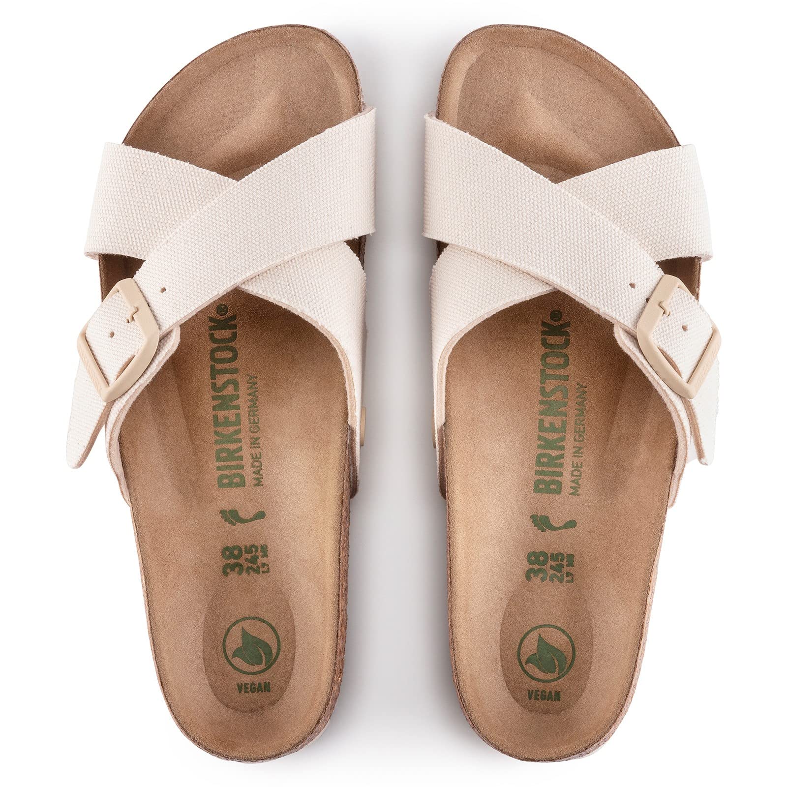 Details: Women's Birkenstock, Siena Vegan Sandal - Narrow Width. A low heel slide style comfort sandal with an elegant look. The simple elegance of this criss cross strap slide is enhanced by the oversized buckle. Vegan design with textured canvas upper Slide style sandal for an easy on and off with adjustable buckle strap Anatomically shaped cork-latex footbed with microfiber lining Raised toe bar encourages the natural gripping motion of your feet Pronounced arch support and deep heel cup for proper foot alignment Lightweight, shock-absorbing EVA outsole Please be advised that the Birkenstock Narrow width accommodates both traditional narrow and medium widths. Regular accommodates Regular to Wide.