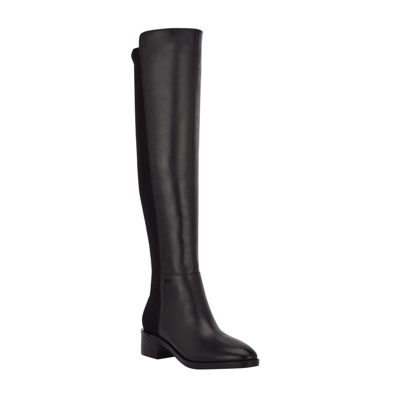 Details: Cover up your feet before stepping out on cold days, wearing Calvin Klein Deedee. Leather and textile upper. Textile and man made lining. Comfort insole. Pointed toe. Over-knee height. Zipper side closure. Low block heel. Man-made lugged outsole. Measurement:Heel height: 1.61".Boot shaft height: 18.5".Shaft circumference: 13.23".