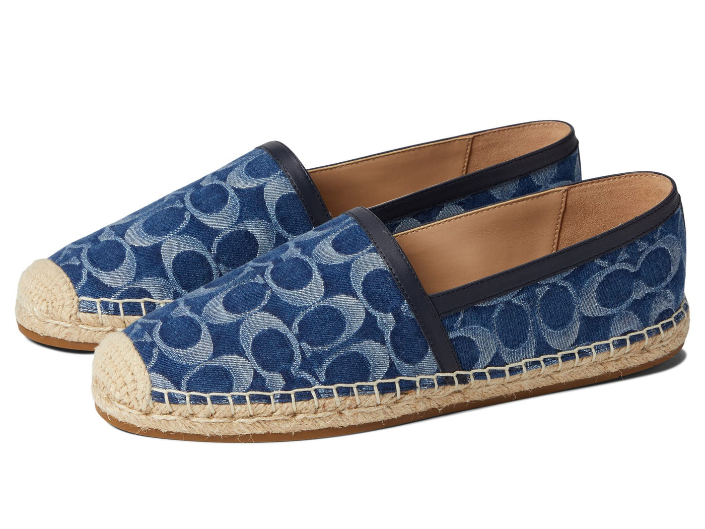 Details: A perfect combination of comfort and style, the COACH Collins Denim Espadrille is a great addition to your footwear collection. Leather and textile upper. Slide-in style. Brand's signature print on the upper. Jute braid detail on toe and outsole for an enhanced look. Textile and synthetic outsole with high traction and durability. Imported.