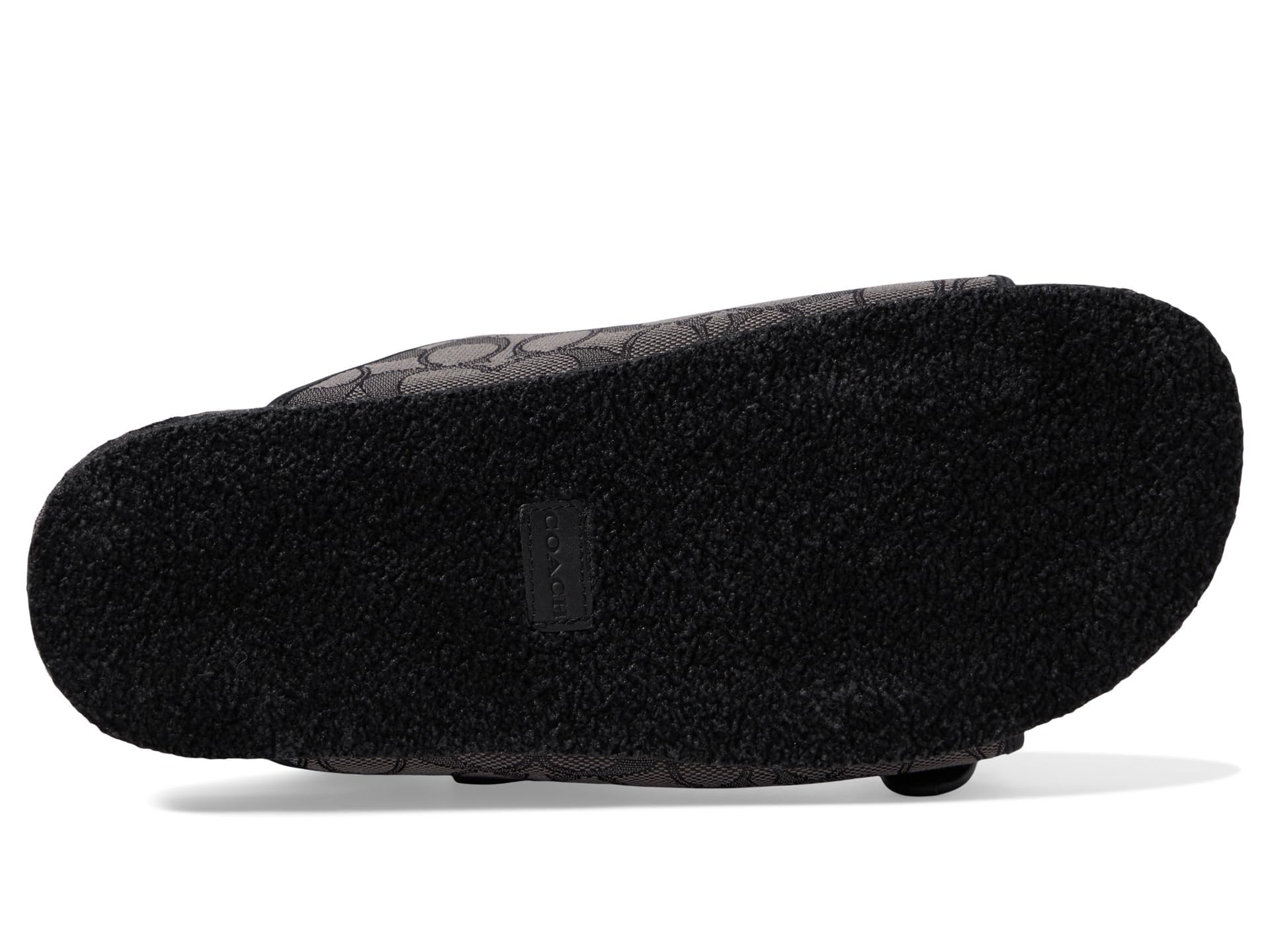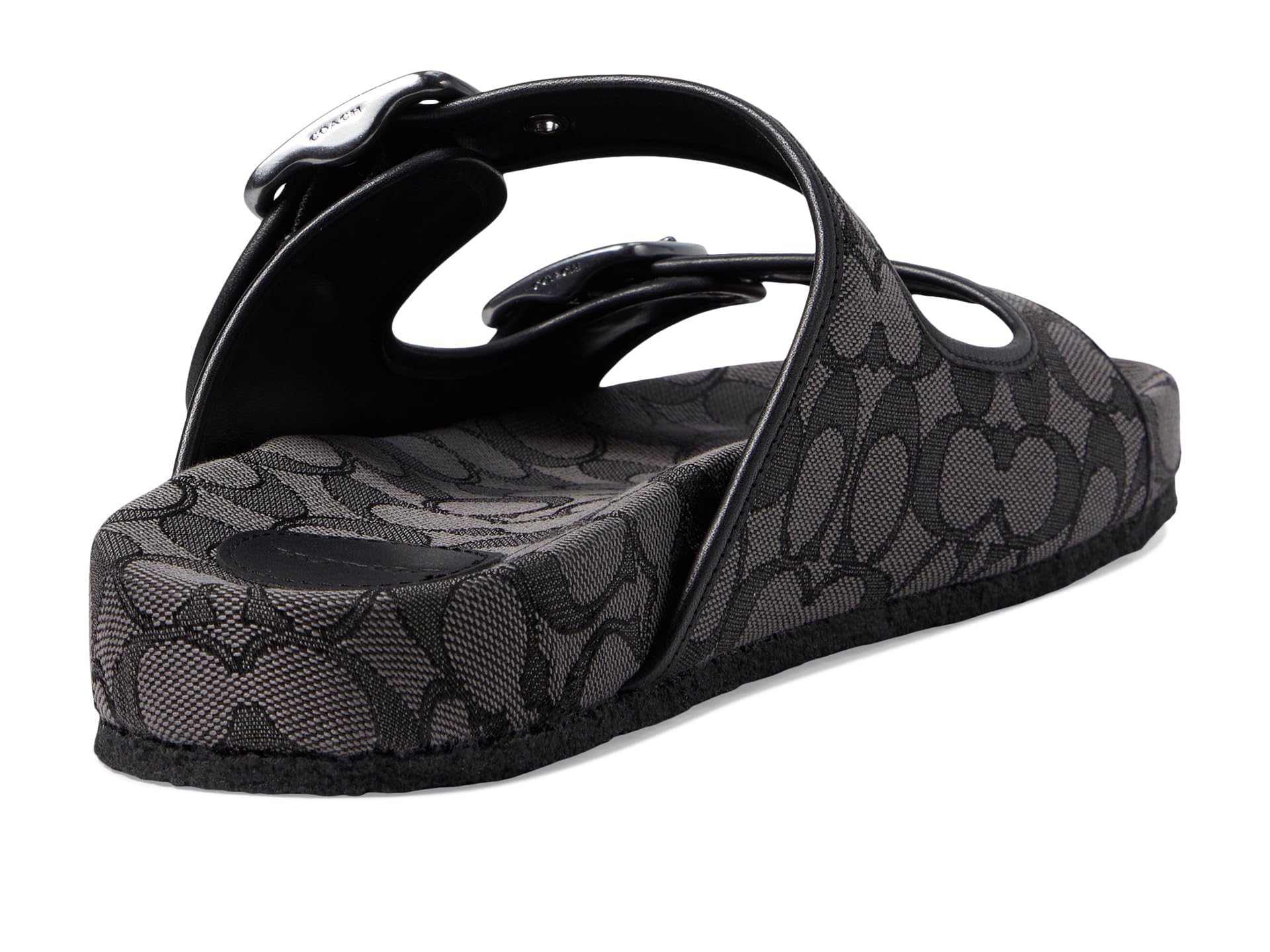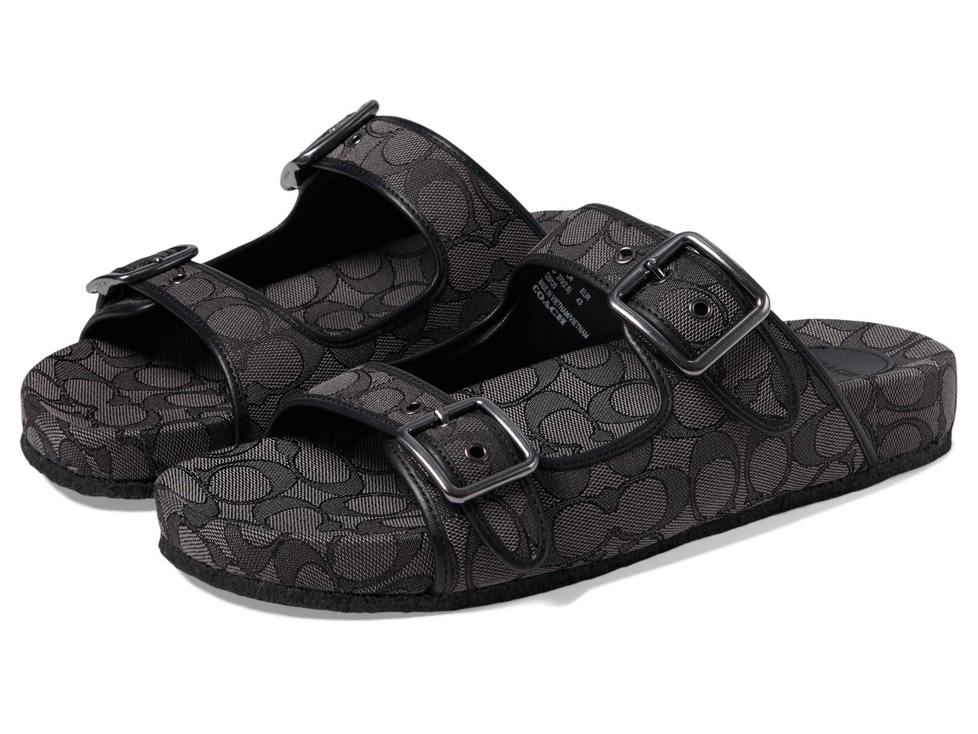 • The COACH Signature Buckle Strap Sandal has leather and textile upper. It features dual adjustable buckle detailing, slip-on construction, and brand detailing on the footbed. The cold padding design helps to reduce pain and tenderness.
