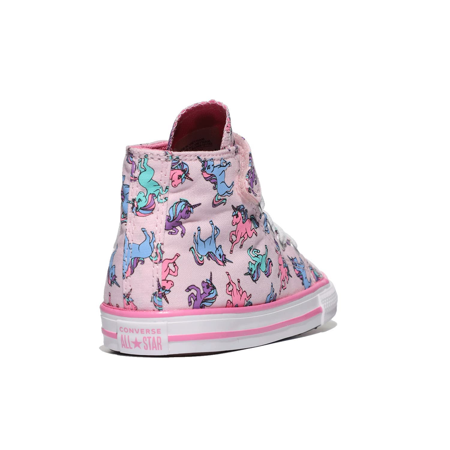 Keep your little one active and comfy in the Converse Ctas 1V Hi sneakers. High top cut. Elastic laces with hook-and-loop strap. Unicorn patterning printed all over. Toe cap design. Textile uppers, linings, and insoles. Synthetic outsoles. Imported.