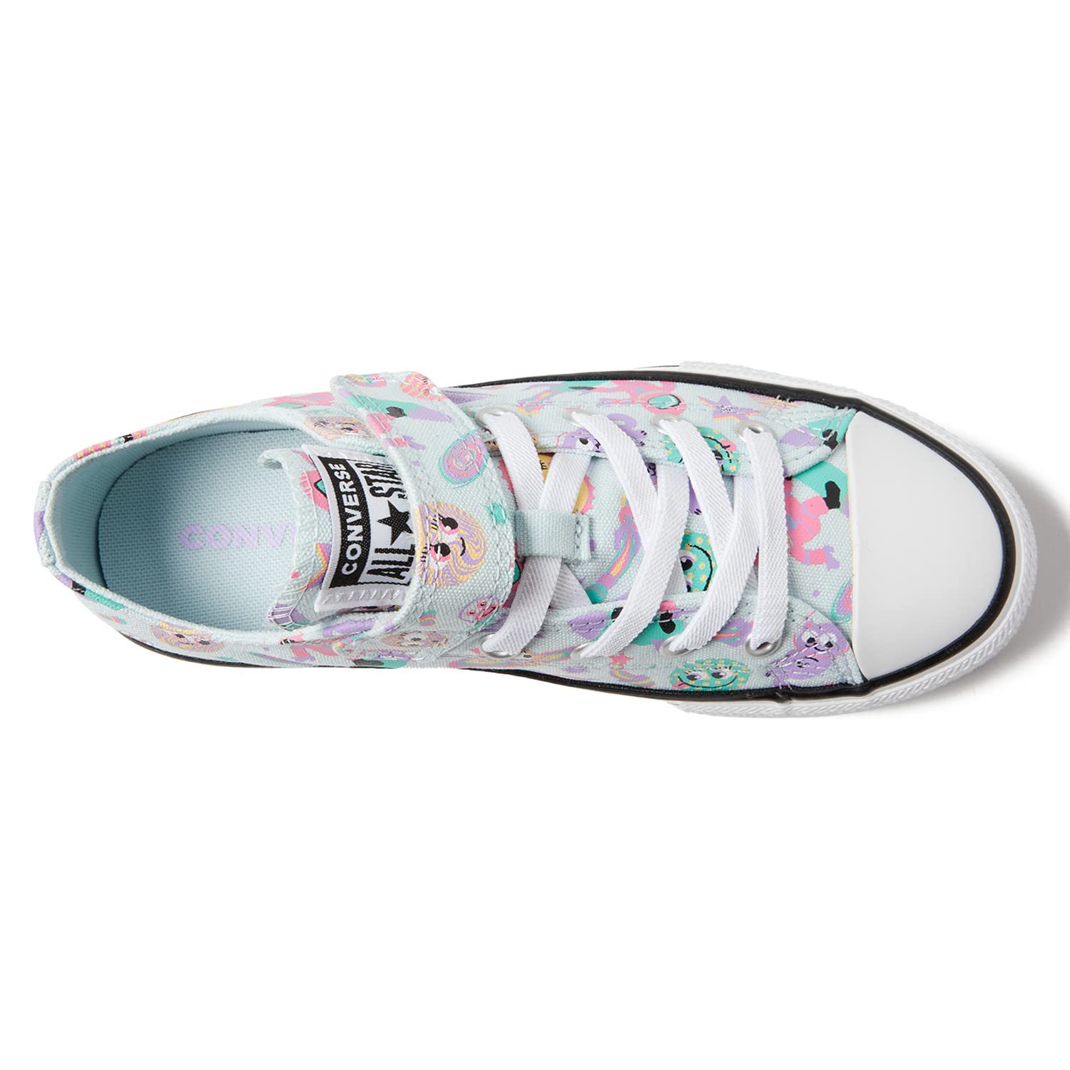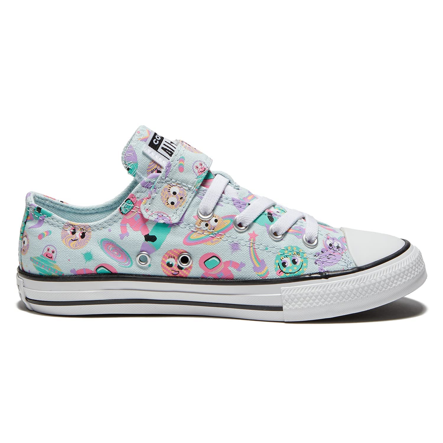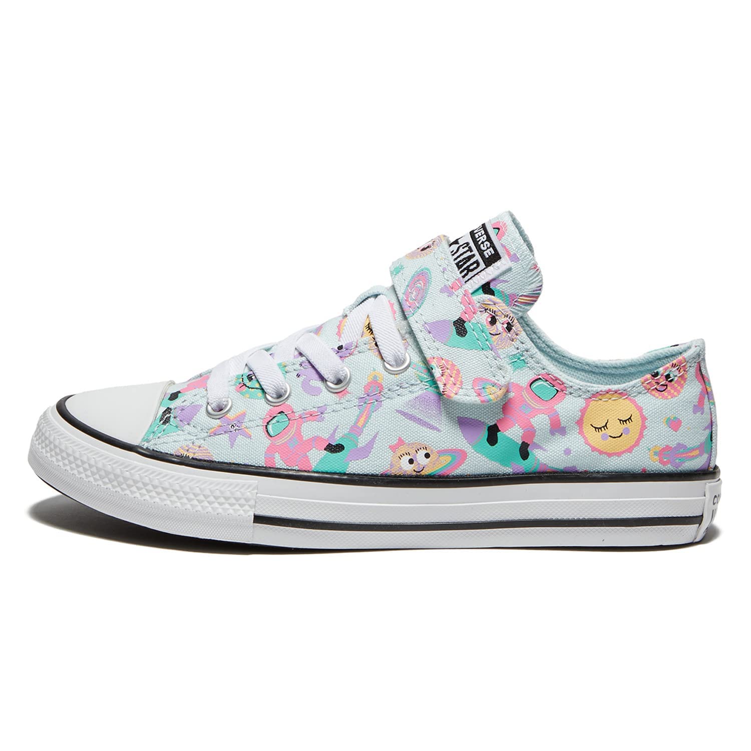 CTAS 1V OX (Little Kid). Hook-and-loop strap closure with fixed laces. Round, closed toe silhouette. Low-top shoe. All-over graphic print. SmartFOAM sockliner for comfort. Contrasting toe cap. Branding on tongue. Textile upper. Textile lining and insole. Textile and synthetic outsole.