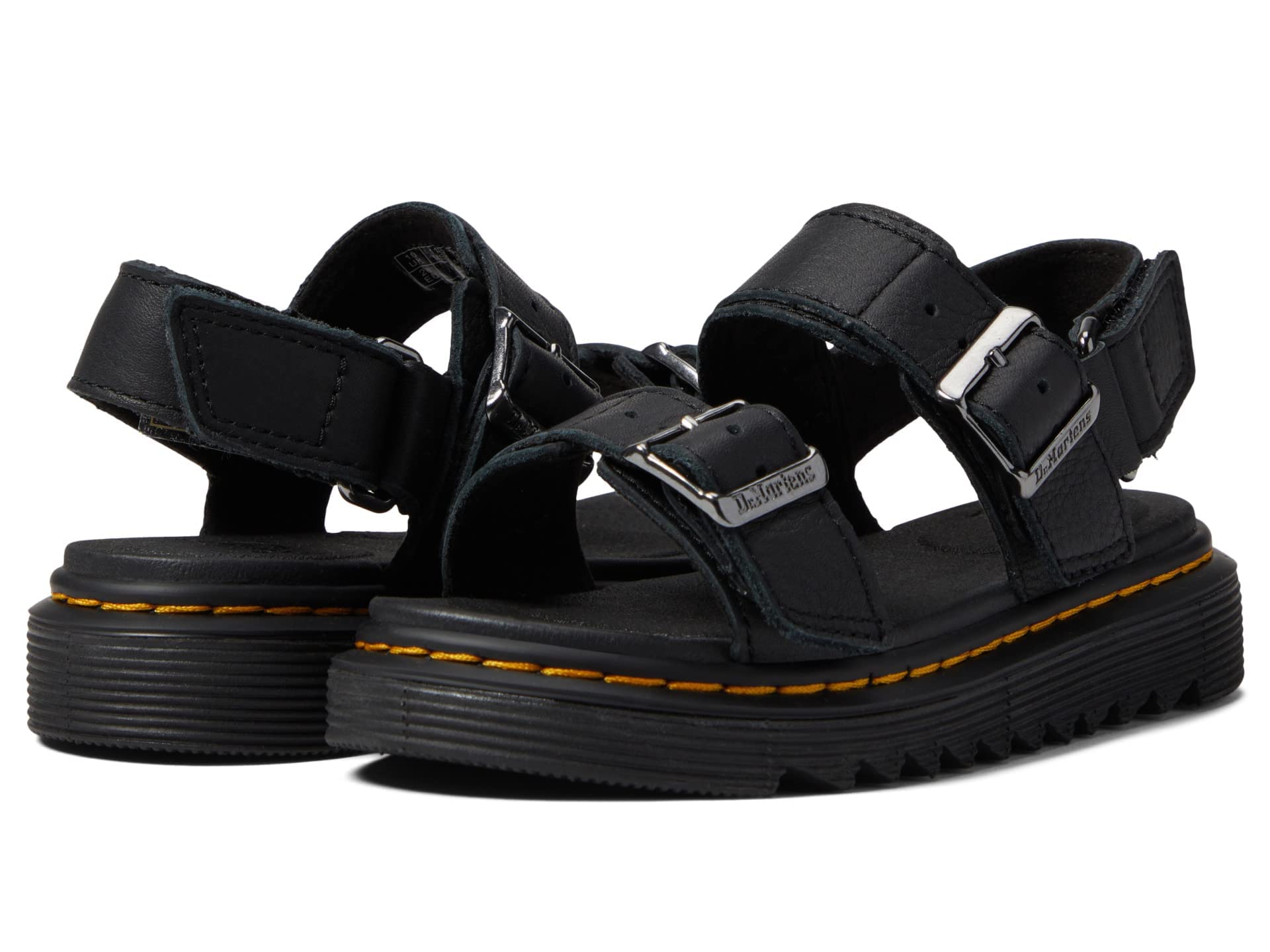 With every step comes style and comfort when you're strutting in the Dr. Martens Kid's Collection Kyle sandals. Leather upper. Double hook-and-loop buckle strap closure. Open round-toe silhouette. Textile lining. Synthetic insole. Textile and synthetic outsole. Heel Height: 45 inWeight: 5 ozPlatform Height: 59 in