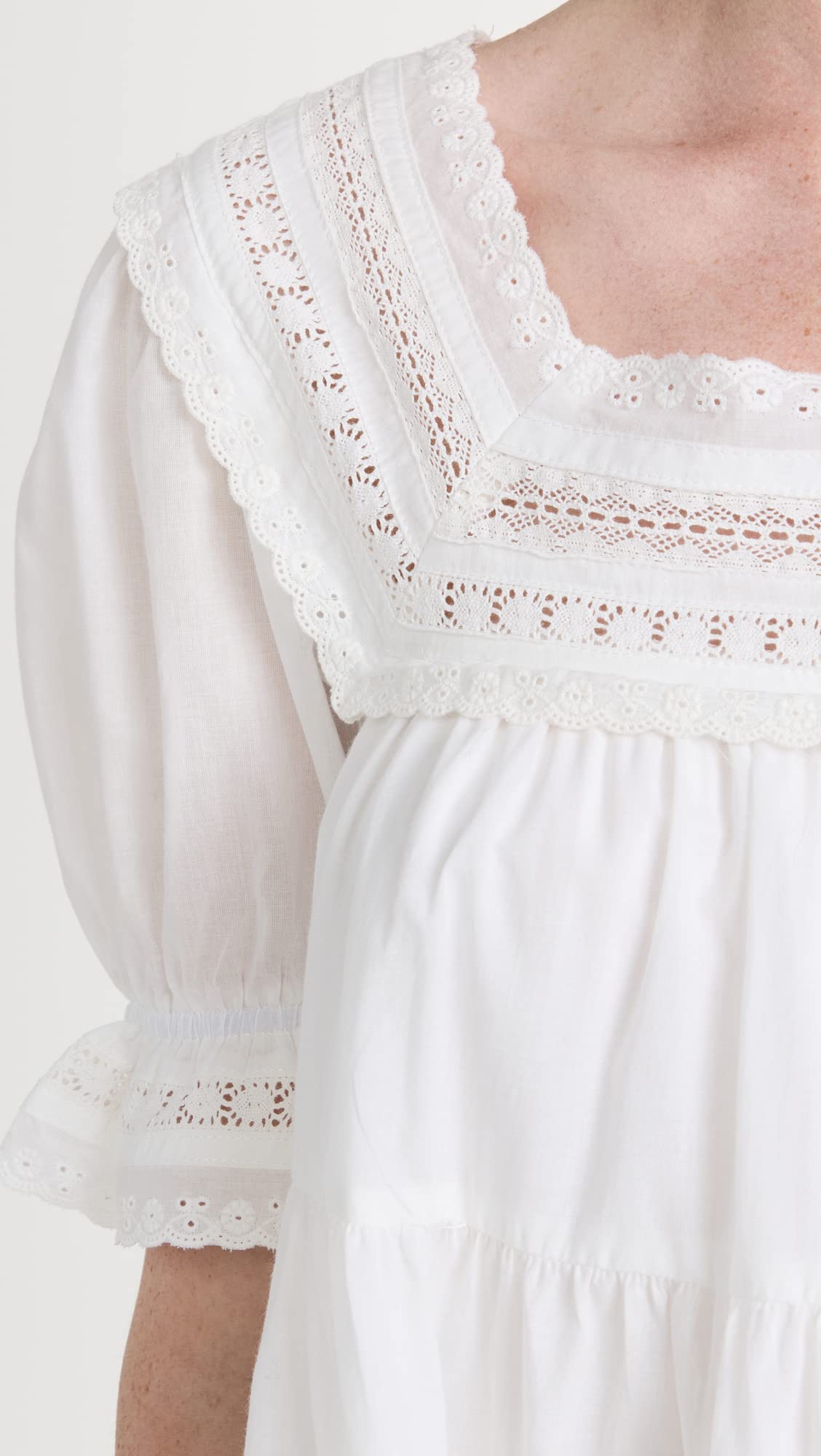 - Crochet lace and ruffle eyelet trim, Tiered design with gathered seams, Square neckline and elbow-length puff sleeves with elastic cuffs