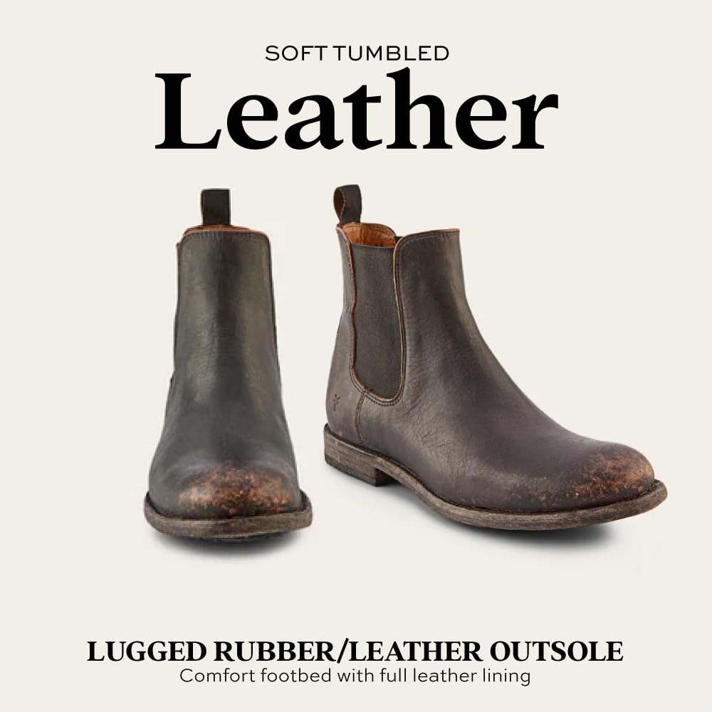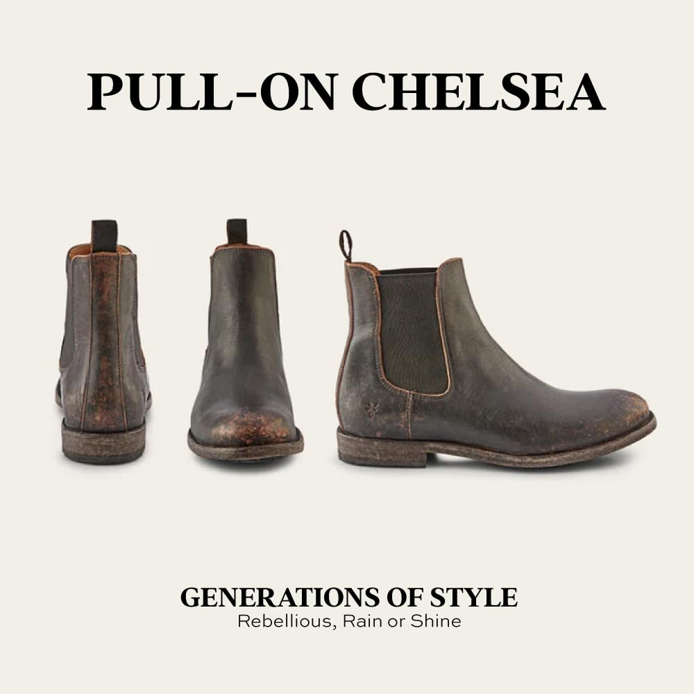 "The Frye Company For more than 153 years, Frye craftsmen have been dedicated to the art of shoemaking, creating modern patterns, discovering materials and even inventing machinery. Rooted in authentic American heritage, The Frye Company uses the best leathers, designs and innovations in the pursuit of timeless, artisanal style. Frye boots were worn by soldiers on both sides of America's Civil War, soldiers in the Spanish-American war, and by Teddy Roosevelt and his Rough Riders. When homesteading drew adventurous New England families to the West during the mid and late 1800's many of the pioneers wore Frye Boots for the long journey. Today Frye remains true to its roots with its line of heritage boots, but continues to innovate as it introduces chic new handbags, pumps, and sandals to its collection. Frye’s mission, to make iconic leather goods that endure, has remained unchanged throughout its storied history. Tyler Chelsea Set on a manageable heel, these blake constructed men’s leather boots are crafted from premium leather featuring a classic silhouette. With functional pull tabs and elasticated side panels, the Tyler Chelsea boots are easy to get on/off. And the injected rubber forepart in the leather outsole and rubber toplift for traction make these boots a failsafe for traversing city terrain, and the comfort footbed with full leather lining offers guaranteed comfort."
