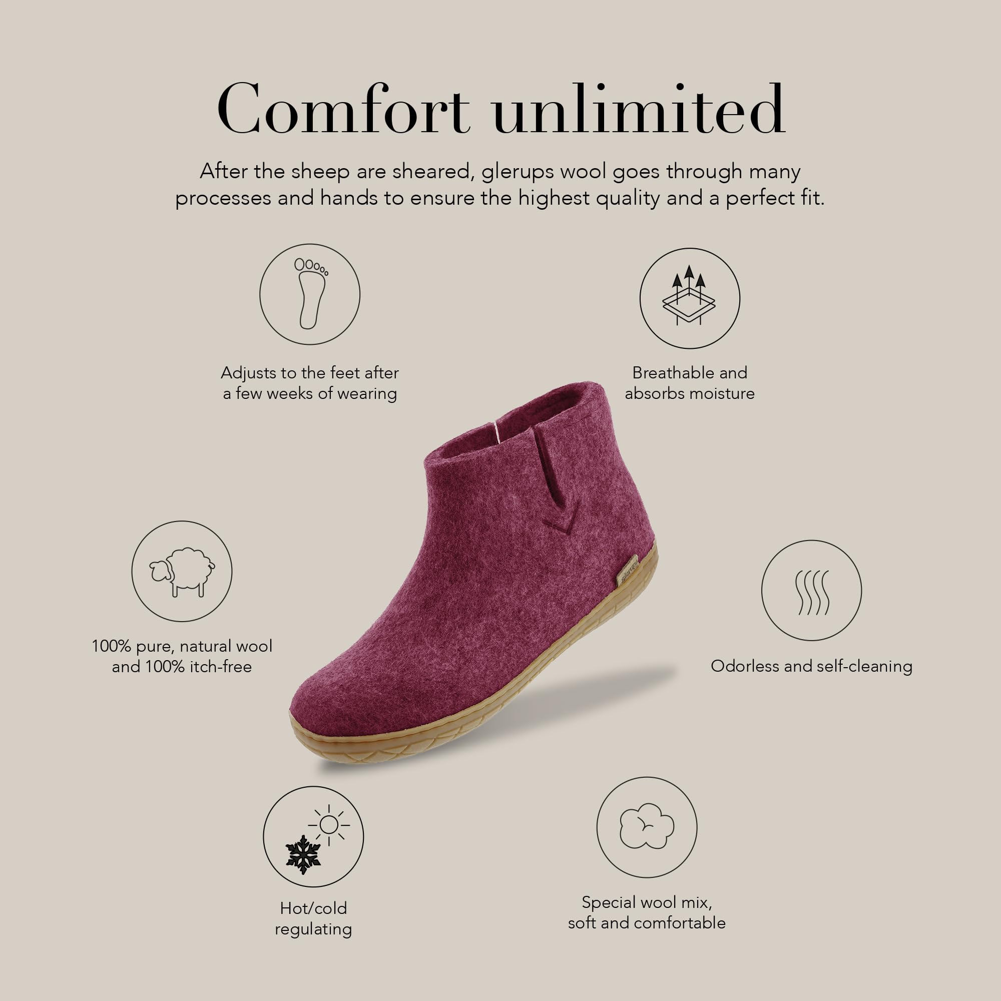 Glerups 100% quality wool mix Boot Slipper with rubber sole - Unisex - Cranberry - Size 6