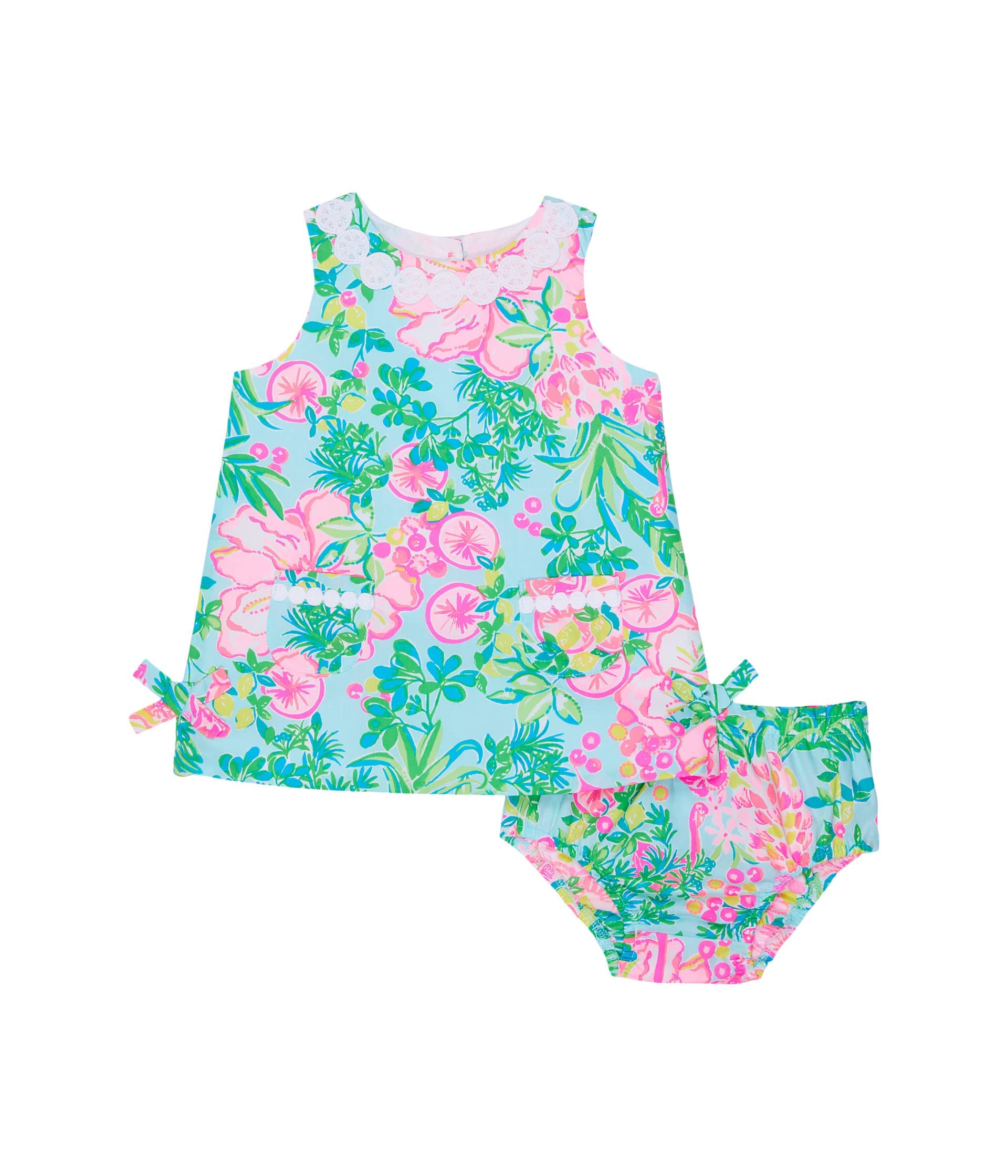 Details: Lilly Pulitzer Infants Size Guide Lilly Pulitzer Girls Size Guide The Lilly Pulitzer® Kids Baby Lilly Shift dress is ready for spring! Sleeveless shift dress in printed cotton poplin fabrication. Round neckline. Back button closure and tulip hem. White lace trims the neckline and front patch pockets. Bows sit atop the side vents. Matching bloomers included. 100% cotton;