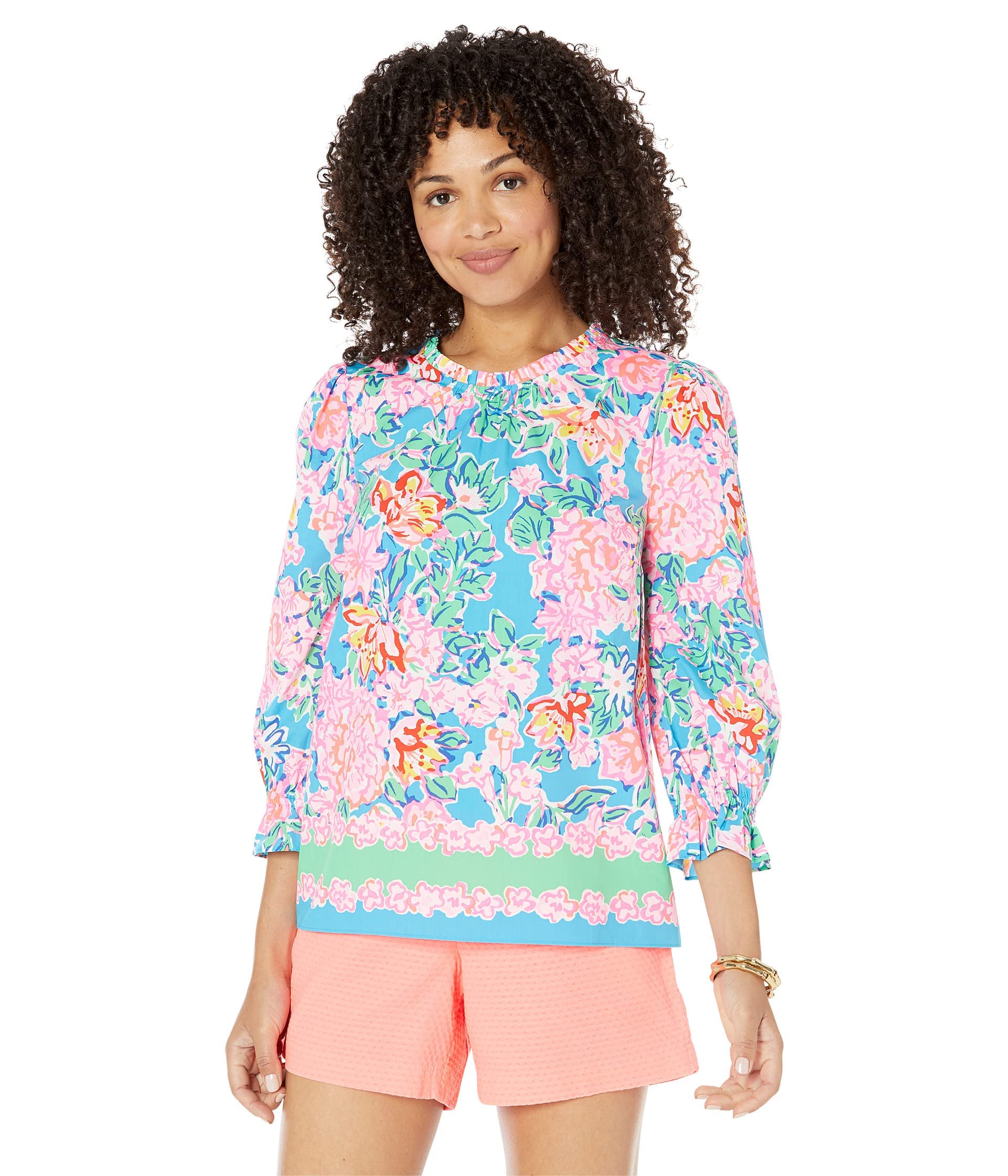 Give a floral twist to your style, wearing Lilly Pulitzer Trista Top. Roomier fit. Pull-on style. Ruffle details at the crew neckline. Quarter length puffed sleeves. Back button closure. Elastic and ruffle hem finish. Vibrant engineered floral print. 100% cotton. Dry clean or machine wash, tumble dry.