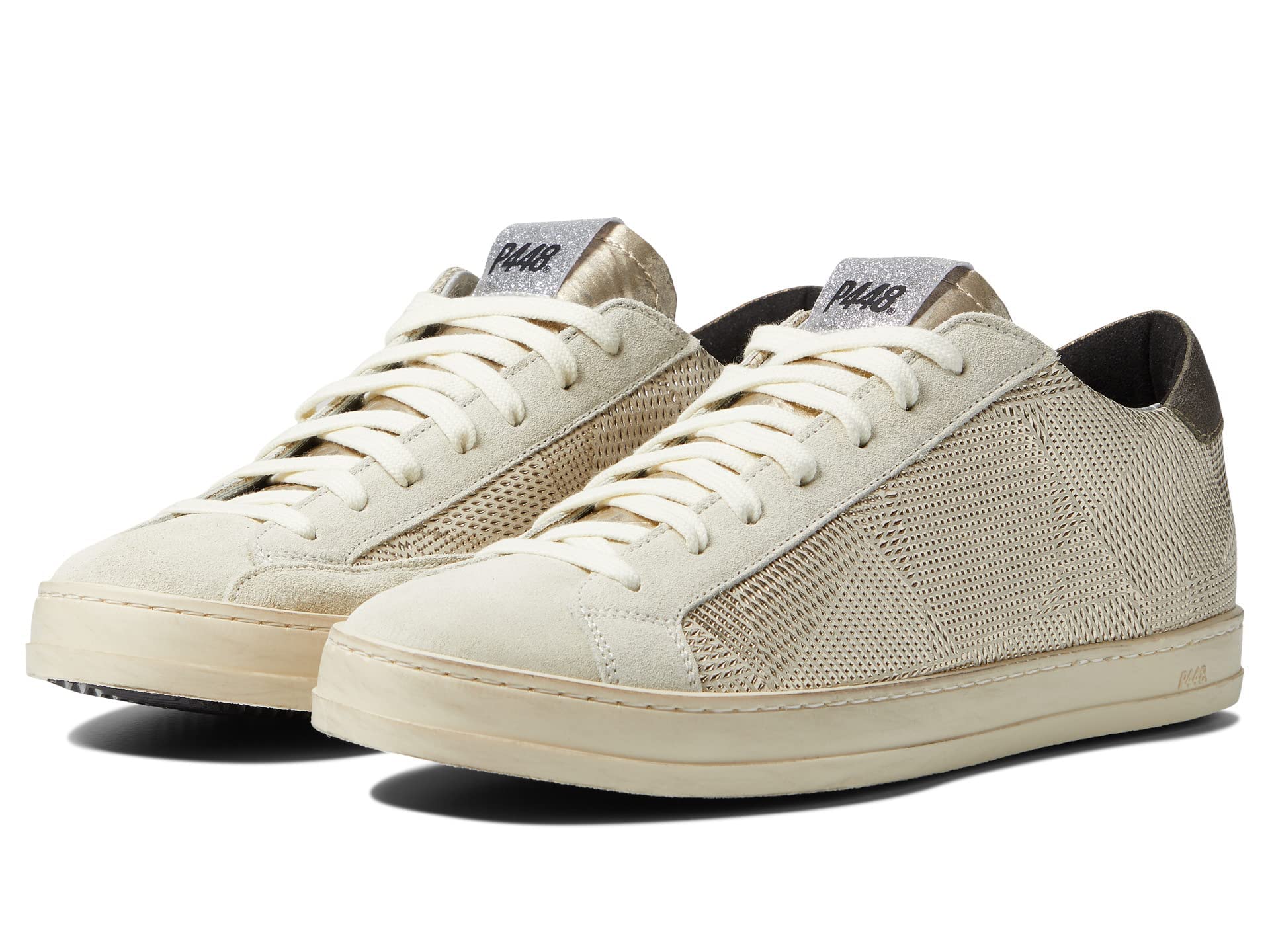 Expect the unexpected. Meet the John Prisma, featuring a beige suede upper with a metallic gold underlay, an abstract printed gold-patent tongue, cashmere suede trim, toe, a metallic bronze heel tab and cream cotton laces.