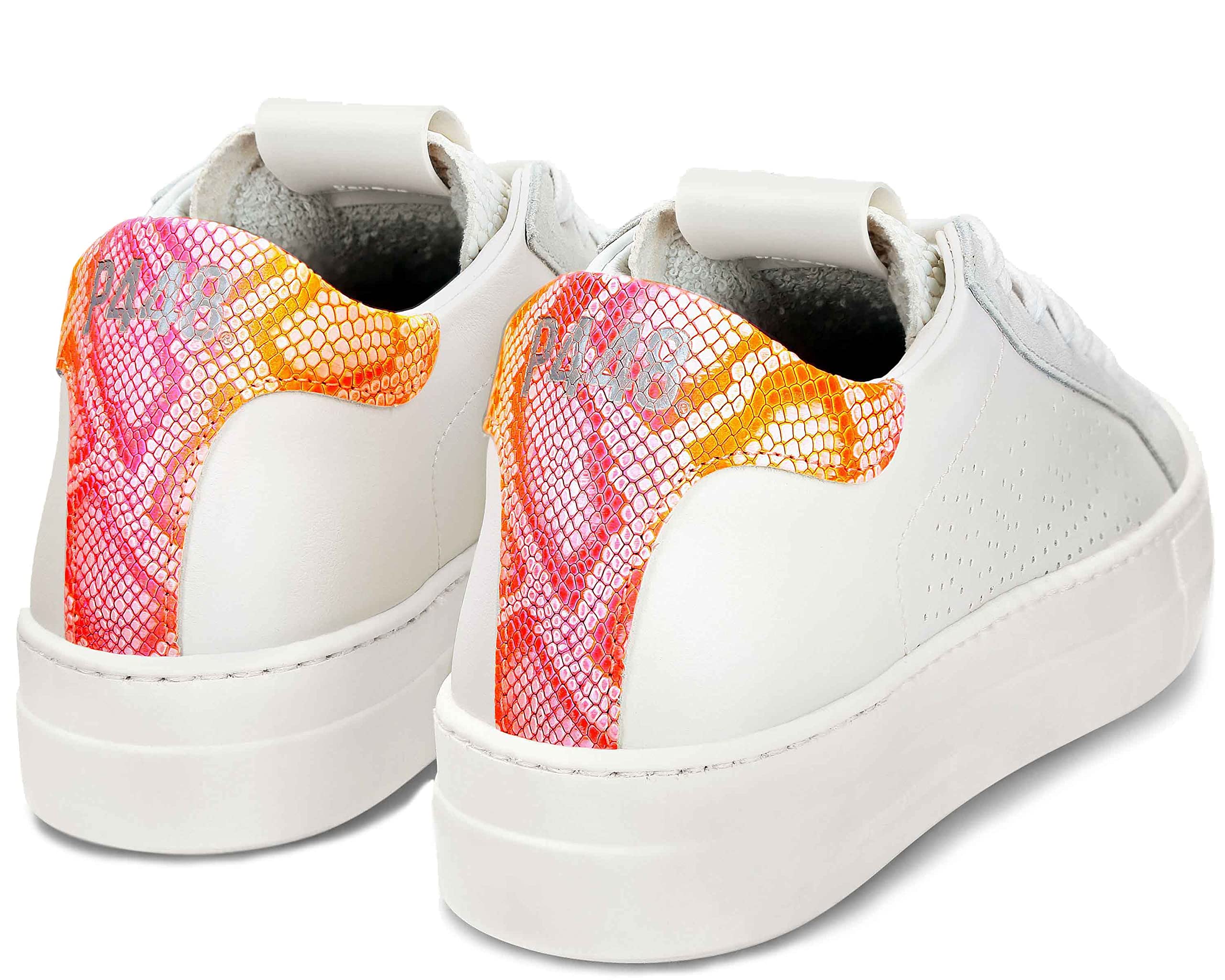 • Fluorescent pink citrus snakeskin textured leather heel tab