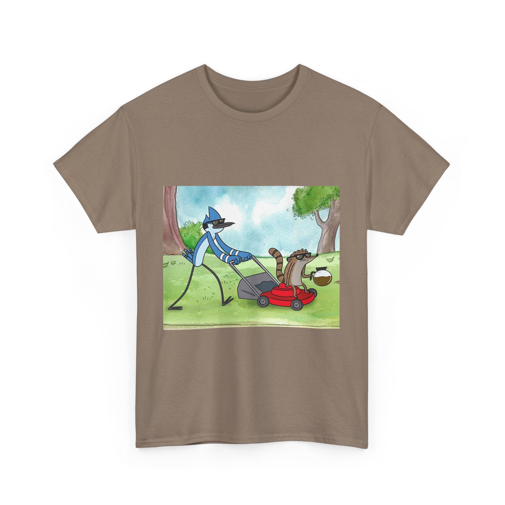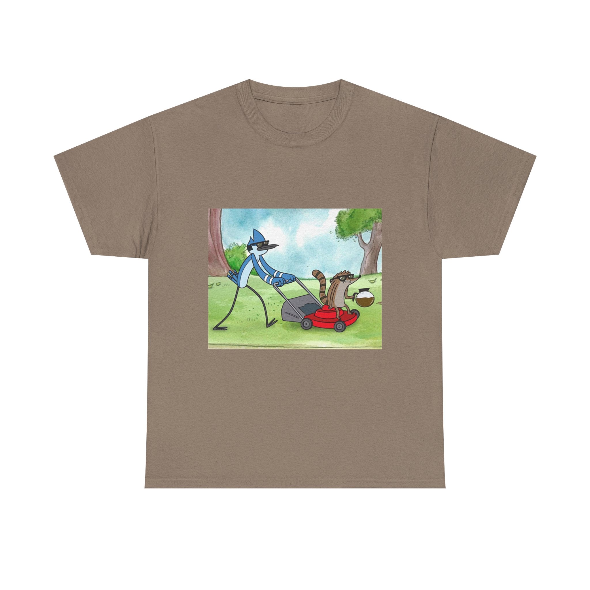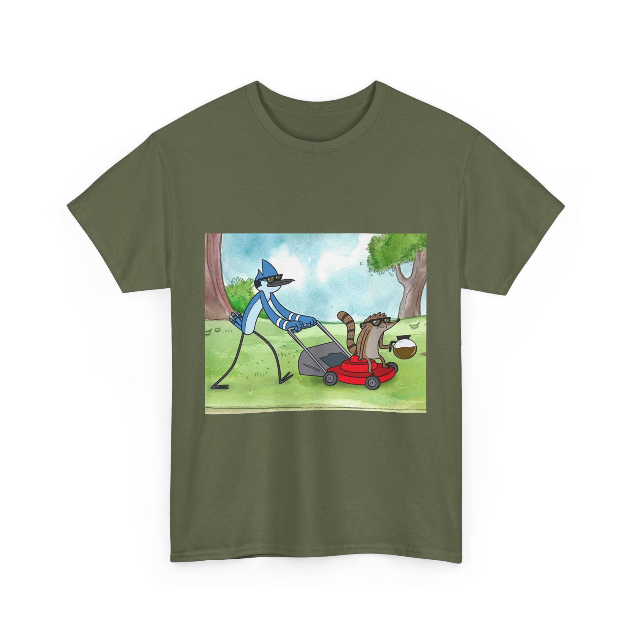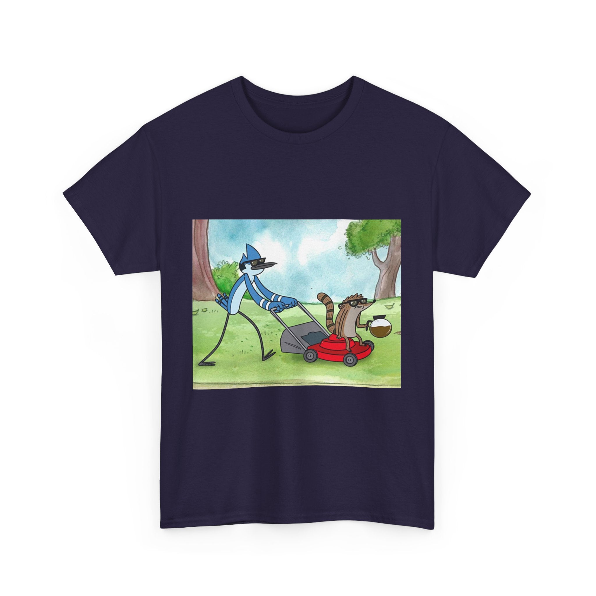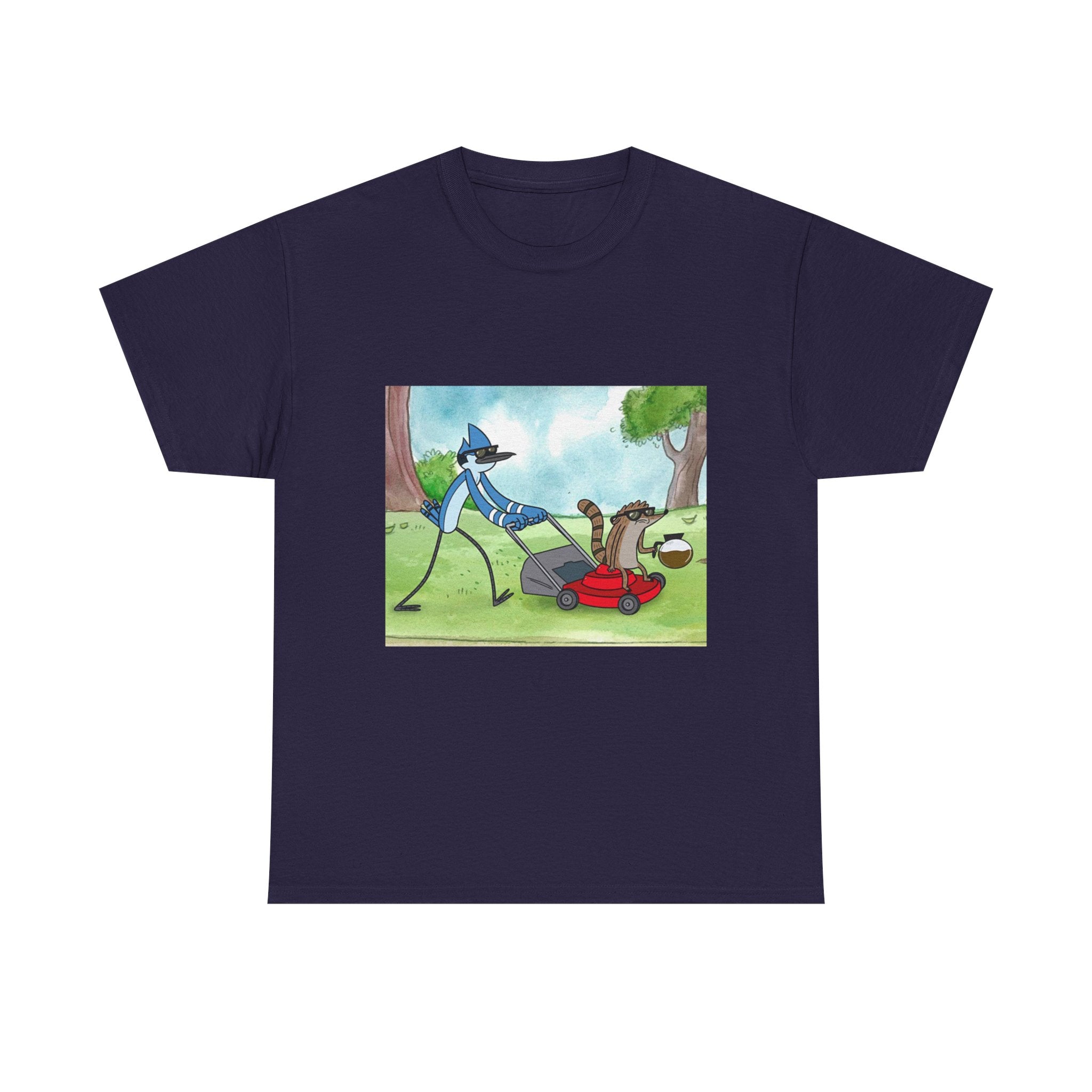 This t-shirt pays tribute to the most laid-back and hilarious duo in animation. Capturing the essence of a sarcastic blue jay and a carefree raccoon, this garment is perfect for those who love absurd humor and unpredictable situations. Made of soft and breathable cotton, it's great for everyday wear or binge-watching your favorite episodes. Put it on and relive the essence of the park!
