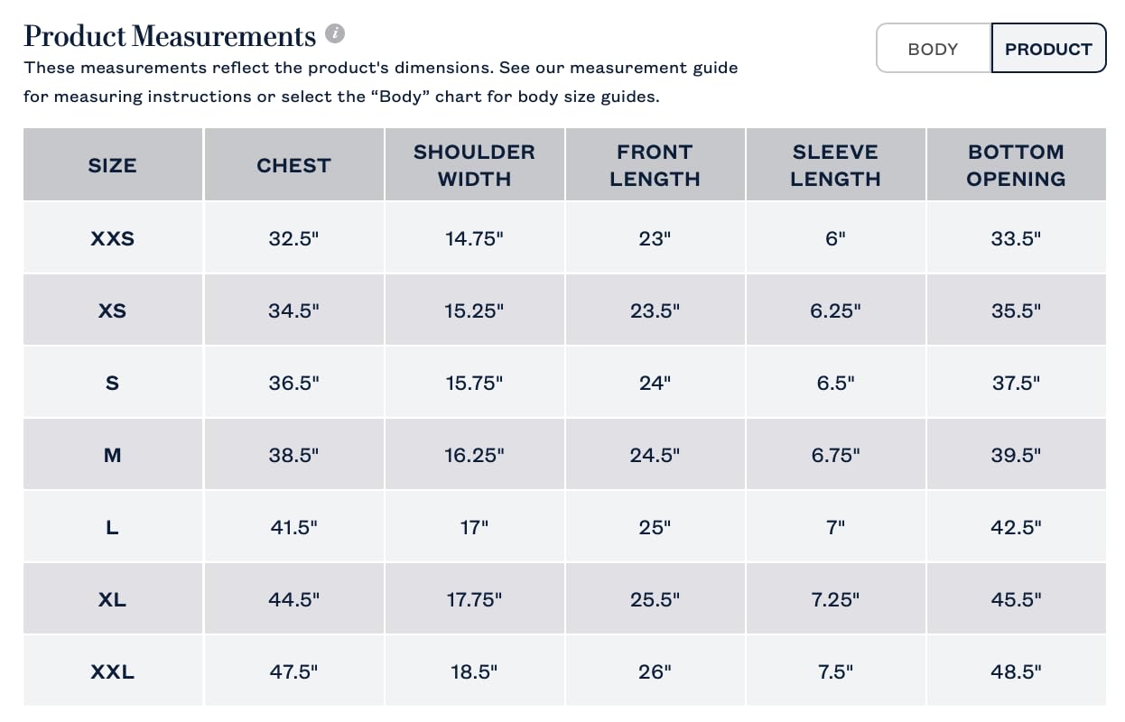 - Size medium has a 24½" body length. Body length is taken from the high point of the shoulder.