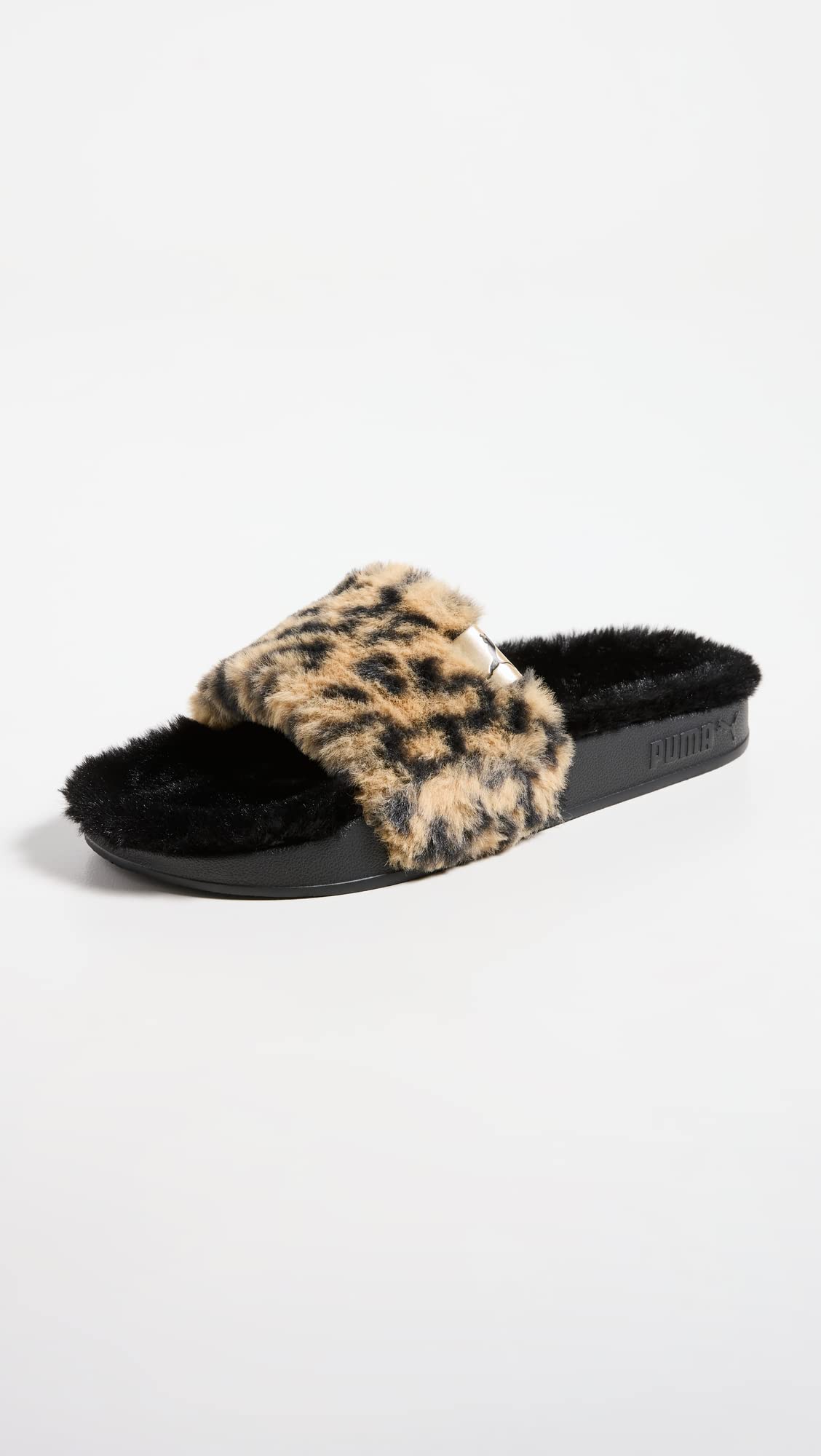 Plush faux fur in a mix of black and leopard-spotted hues adds a cool and extra-comfy feel to these PUMA slide sandals.