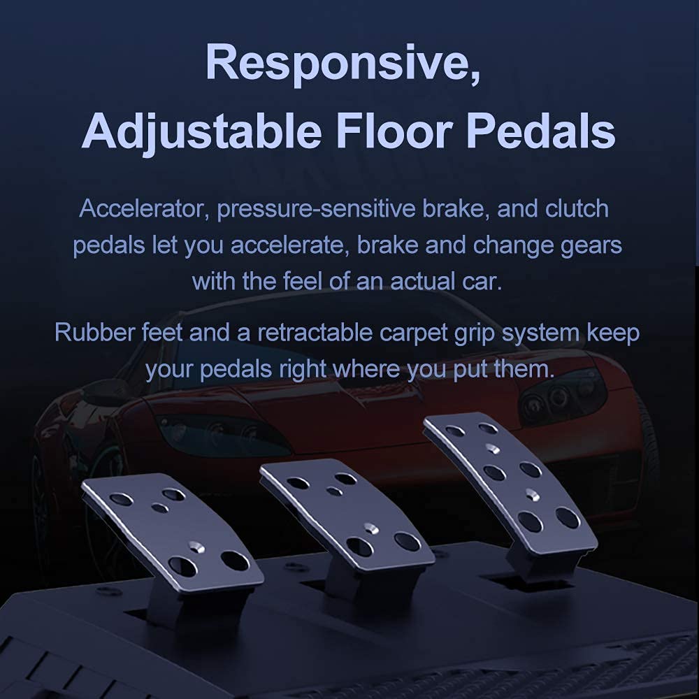 - 【Adaptive Angle Linear Pedal and Manual Gear Lever】: the gear lever and pedal perfectly cooperate with the steering wheel to create a more realistic game experience. The rubber foot of the pedal and the retractable carpet grip system keep the pedal in the correct position. Because auto gear is usually the default gear for racing games, it is not recommended to use the gear lever when playing racing games.