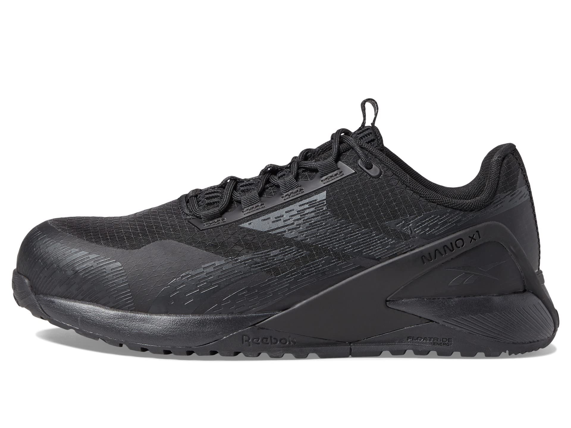 Stay active in all-day comfort and style with the Reebok Work Nano X1 Adventure Work EH Comp Toe sneakers. XTR brand composite safety toe meets or exceeds ASTM F2413-18 I/C (Impact and Compression), EH (Electrical Hazard) safety standards. Metal free. Mesh with TPU heel stabilizer upper. Lace-up closure. Moisture wicking nylon mesh lining. Bootbed memory foam footbed. Floatride energy foam midsole. Slip-resistant rubber outsole meets or exceeds ASTM F3445-21 standard.