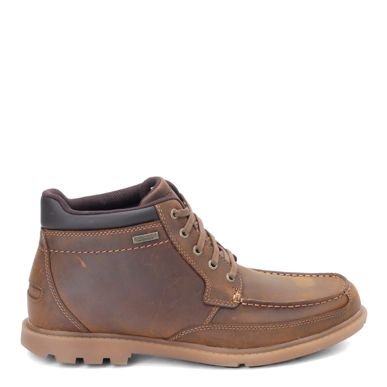 Men's Rockport, Patten Moc Boot. Just right for a weekend hike on the trail or a day at home. The rounded toe and lace up front provide casual styling, and stitch-to-sole construction keeps these men's boots flexible and durable. Waterproof leather upperDEWIX linings help to reduce foot and wick moisture to keep the foot dryOrtholite footbed provides immediate but sustainable cushioning that offers all-day comforttruTECH sport technology helps provide shock-absorbing heel cushioningMolded TPR outsole provides a durable grip on a variety of surfacesSlip-resistant outsole tread