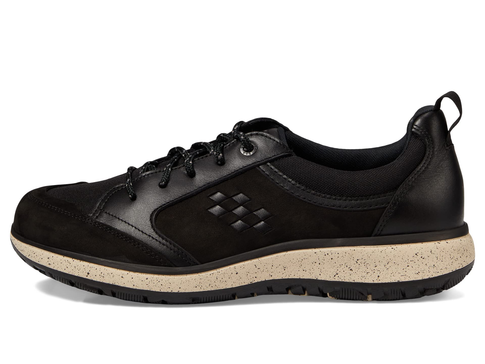 Details: Women's SAS, Boulder Sneaker. Our Boulder sneaker gives you the comfort and stability you need to make the most of your day. It features a leather and soft knit upper with padded collar, and our dual density contoured molded insole provides breathability and cushioning . Leather and fabric mesh upper is breathable and durable Lace up closure for a secure fit Fabric linings Dual density microfiber covered polyurethane molded insole with an extra layer of memory foam on top Rubber and EVA sole for reliable traction
