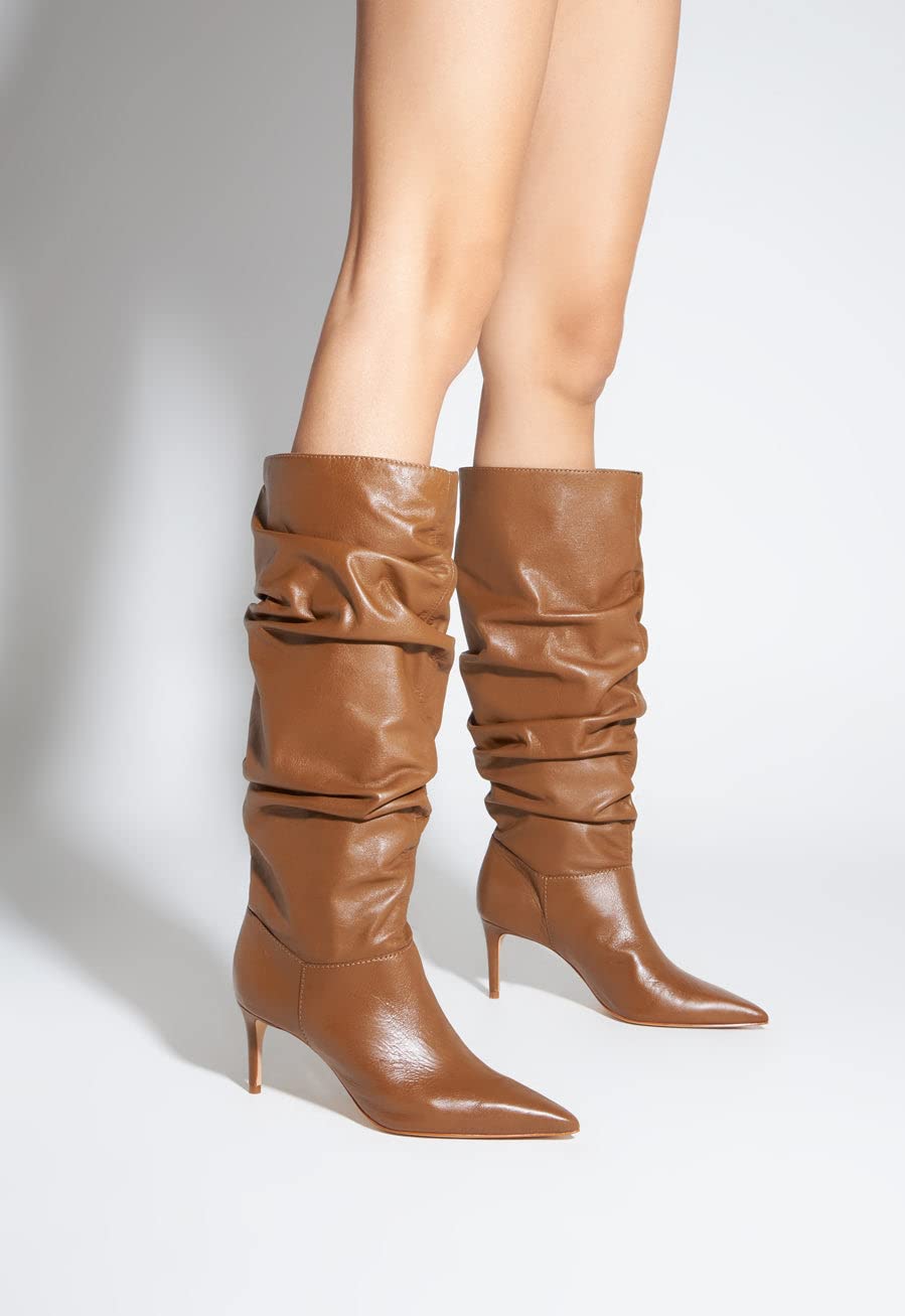 - Materials: Soft Nappa Leather | Cow leather lining | Cow leather outsole|Upper format: Slouch|Heel Type: Mid heel|Heel Style: Stiletto|Closure Type: Zip closure|Toe Style: Pointed toe|Counter Type: Closed|Shaft Circumference: 15.6in | 390mm|Shaft Height: 19.6in | 490mm|Heel Height: 2.7in | 70mm|Rubber patch at the heel.|SKU: S2131200120002