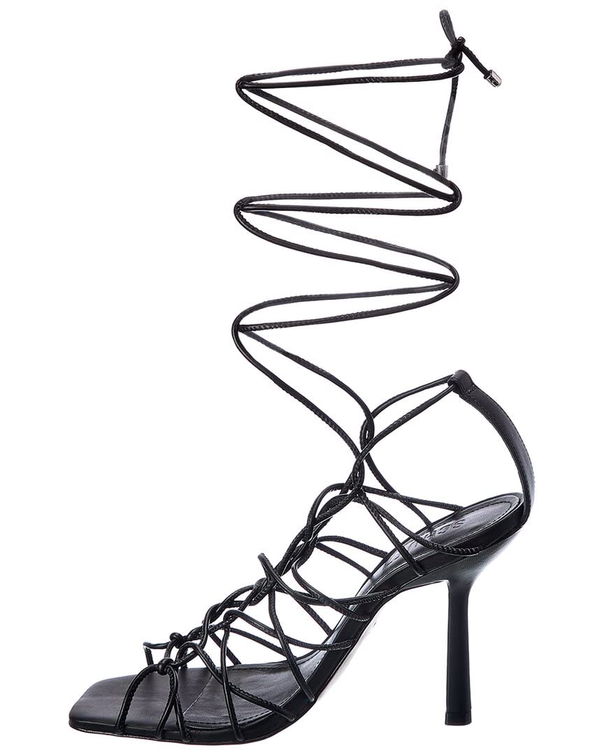 Step up and stand out in the Schutz Heyde heels. Wrap around ankle tie. Strappy design all over top of foot. Open toe design. Square toe silhouette. Stiletto style heels. Leather upper. Leather lining and insole. Leather outsole. Made in Brazil.