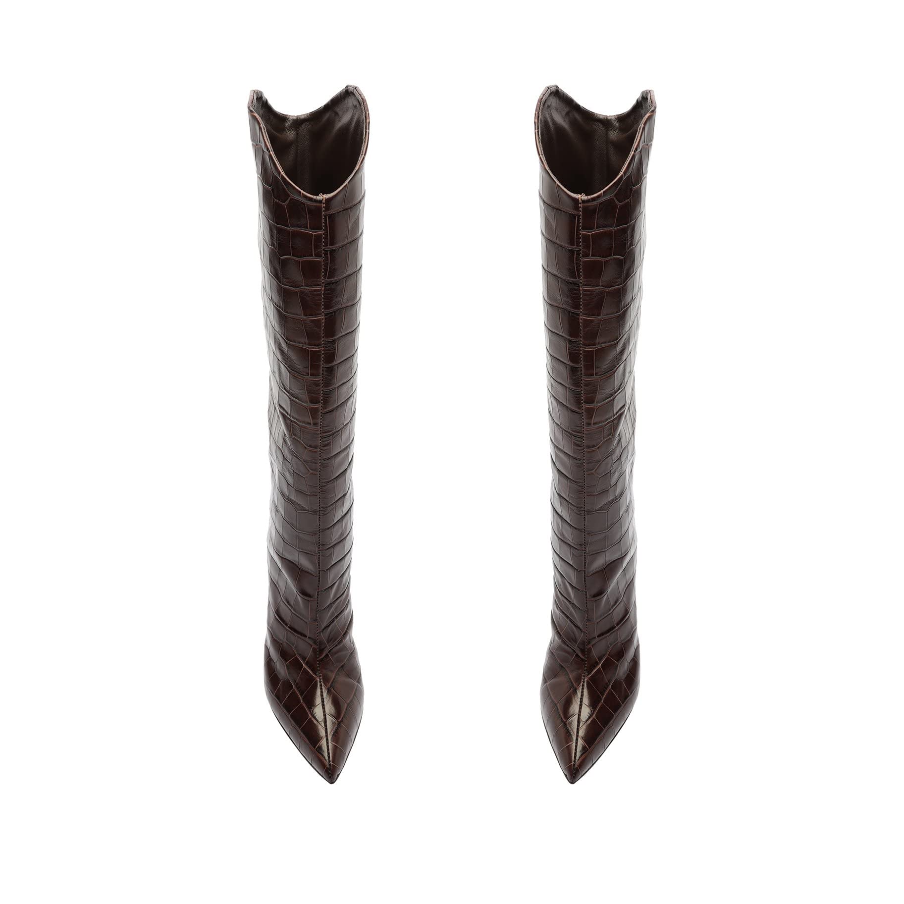 The Maryana Snakeskin will be your go-to day to night Boot shoeall season long. Crafted from snake-embossed leather, this high-heeled boot features a stiletto heel and pointed toe. Let this pair elevate basically everything you own with an effortlessly cool, put-together vibe. Materials: Snake-embossed Leather | Cow leather lining | Cow leather outsole Upper format: Knee High Upper Detail: Embellished upper Rubber patch at the heel. Heel Type: High Heel Heel Style: Stiletto Closure Type: Zip closure Toe Style: Pointed toe Counter Type: Closed Shaft Circumference: 14.5in | 370mm Shaft Height: 13in | 330mm Heel Height: 3.5in | 89mm SKU: S0172303720001