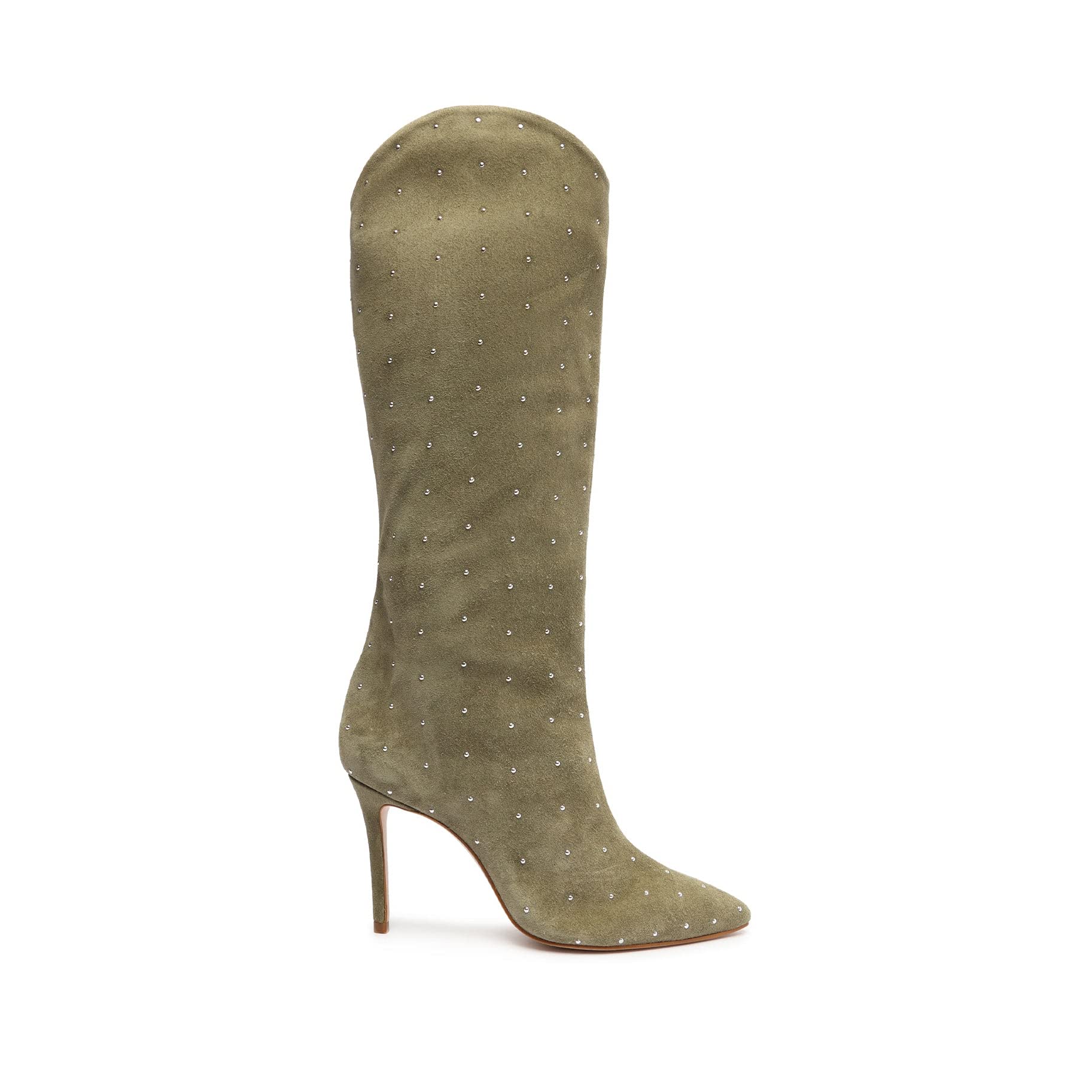 - Materials: Cow Suede | Cow leather lining | Cow leather outsole|Upper format: Plain upper|Upper Detail: Embellished upper|Rubber patch at the heel.|Heel Type: High Heel|Heel Style: Stiletto|Closure Type: Slip-on|Toe Style: Pointed toe|Counter Type: Closed|Shaft Circumference: 16.2in | 405mm|Shaft Height: 13.36in | 334mm|Heel Height: 3.5in | 89mm|SKU: S0172304920004