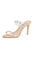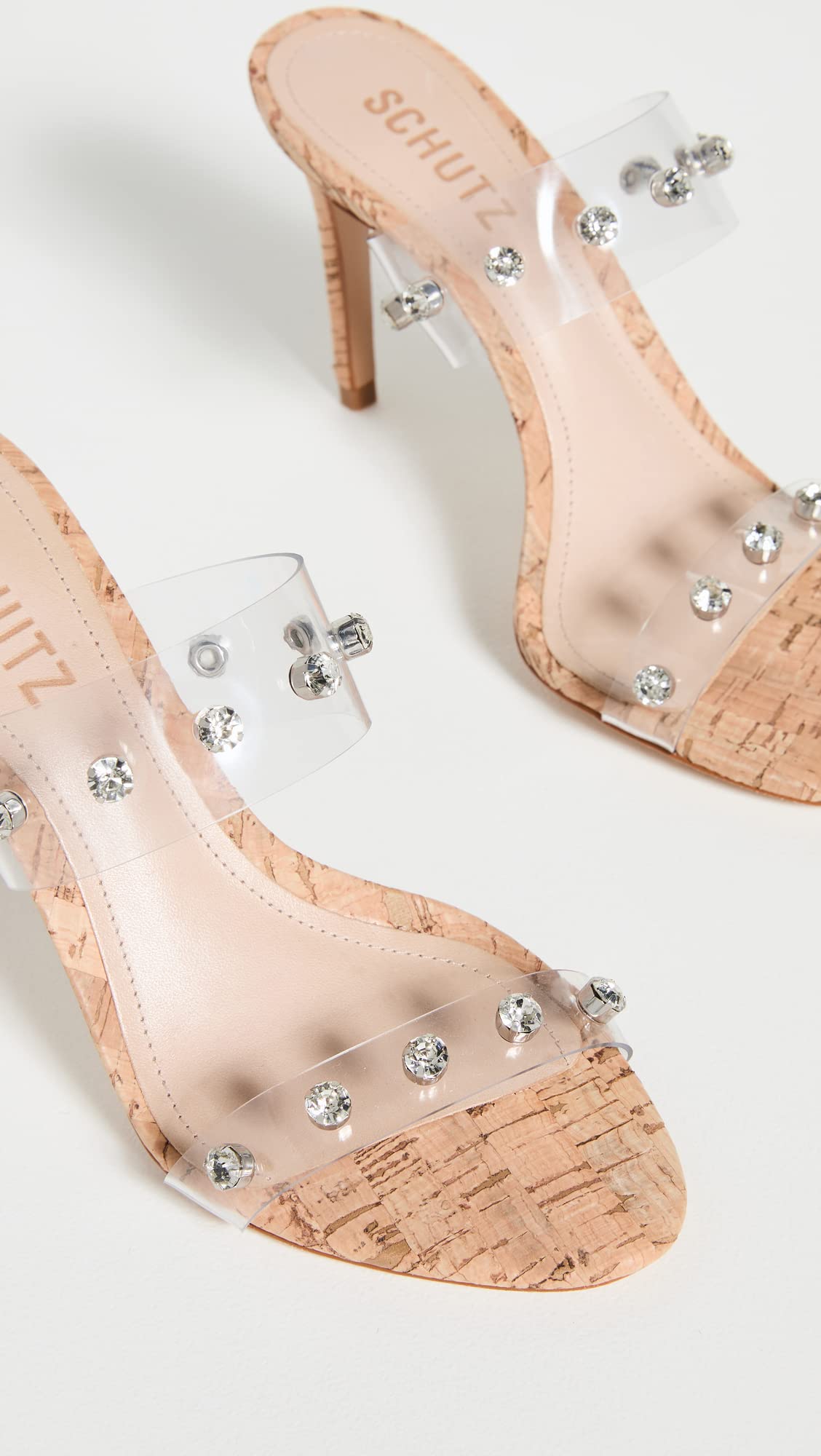 A creative take on heeled sandals from Schutz, featuring an unexpected mix of light-colored cork, transparent vinyl, and brilliant crystals.