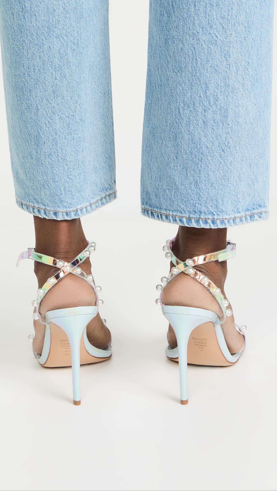Iridescent vinyl and imitation pearl accents draw the eye to these playful yet polished Schutz heeled sandals.