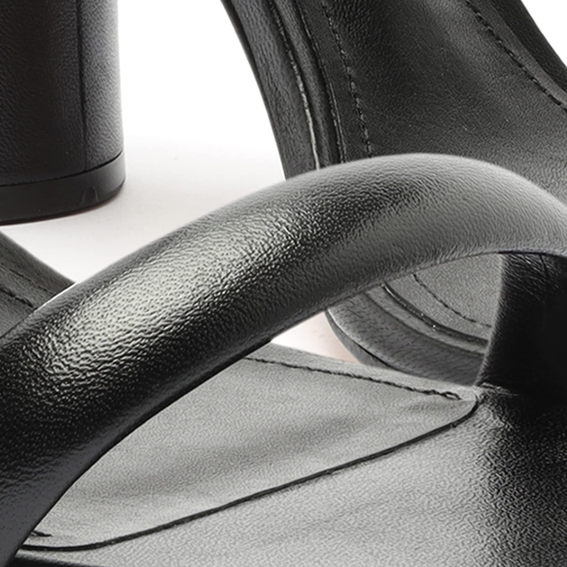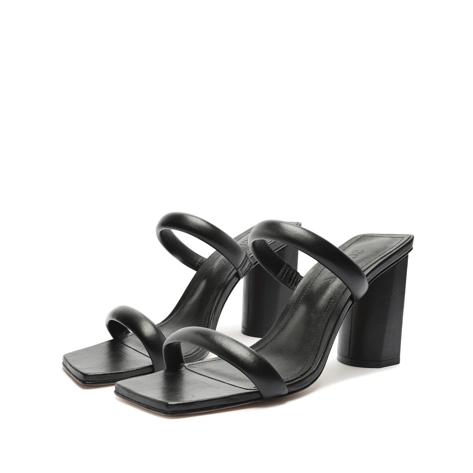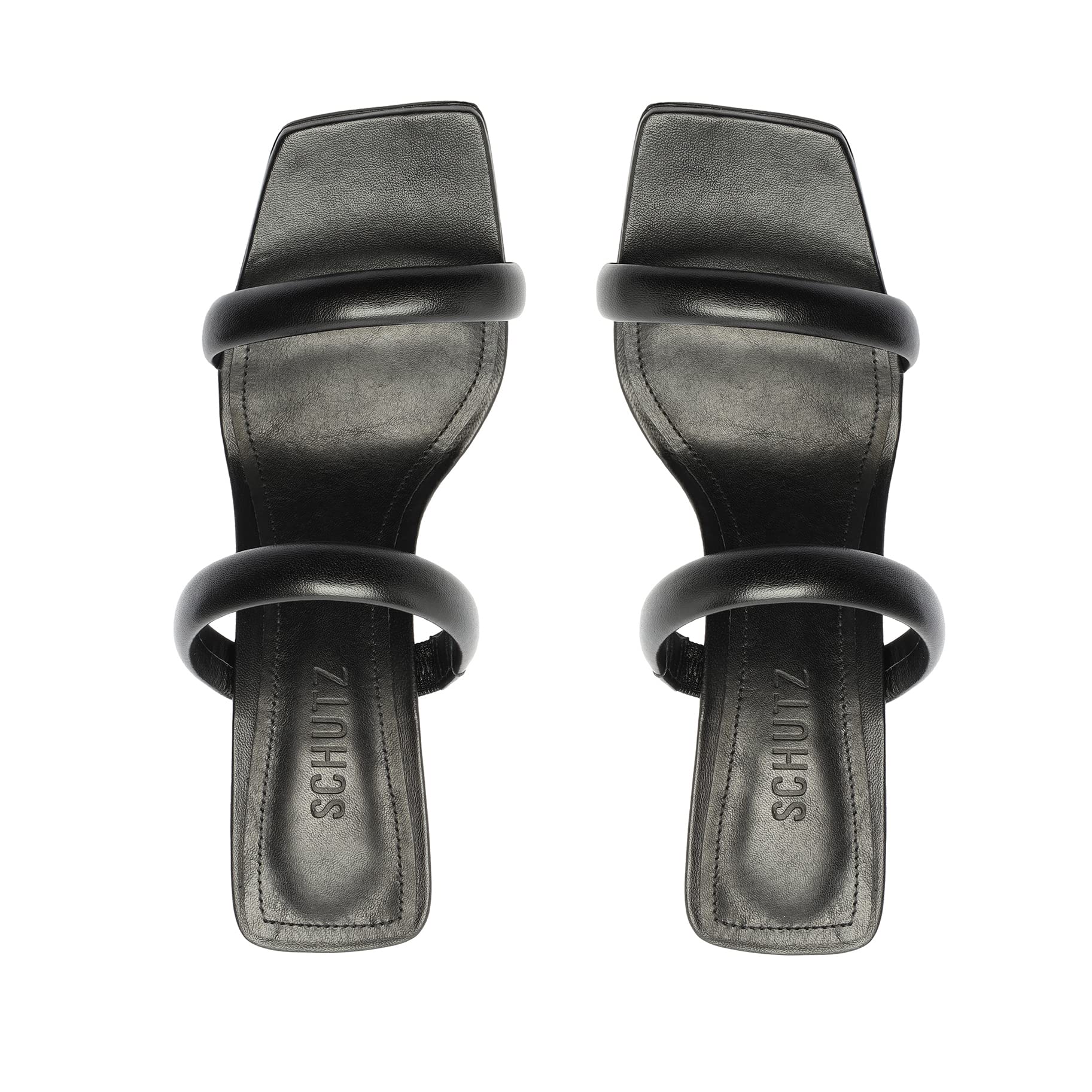 A minimalist pair of Schutz sandals with a two-strap design and block heel, crafted from smooth leather.
