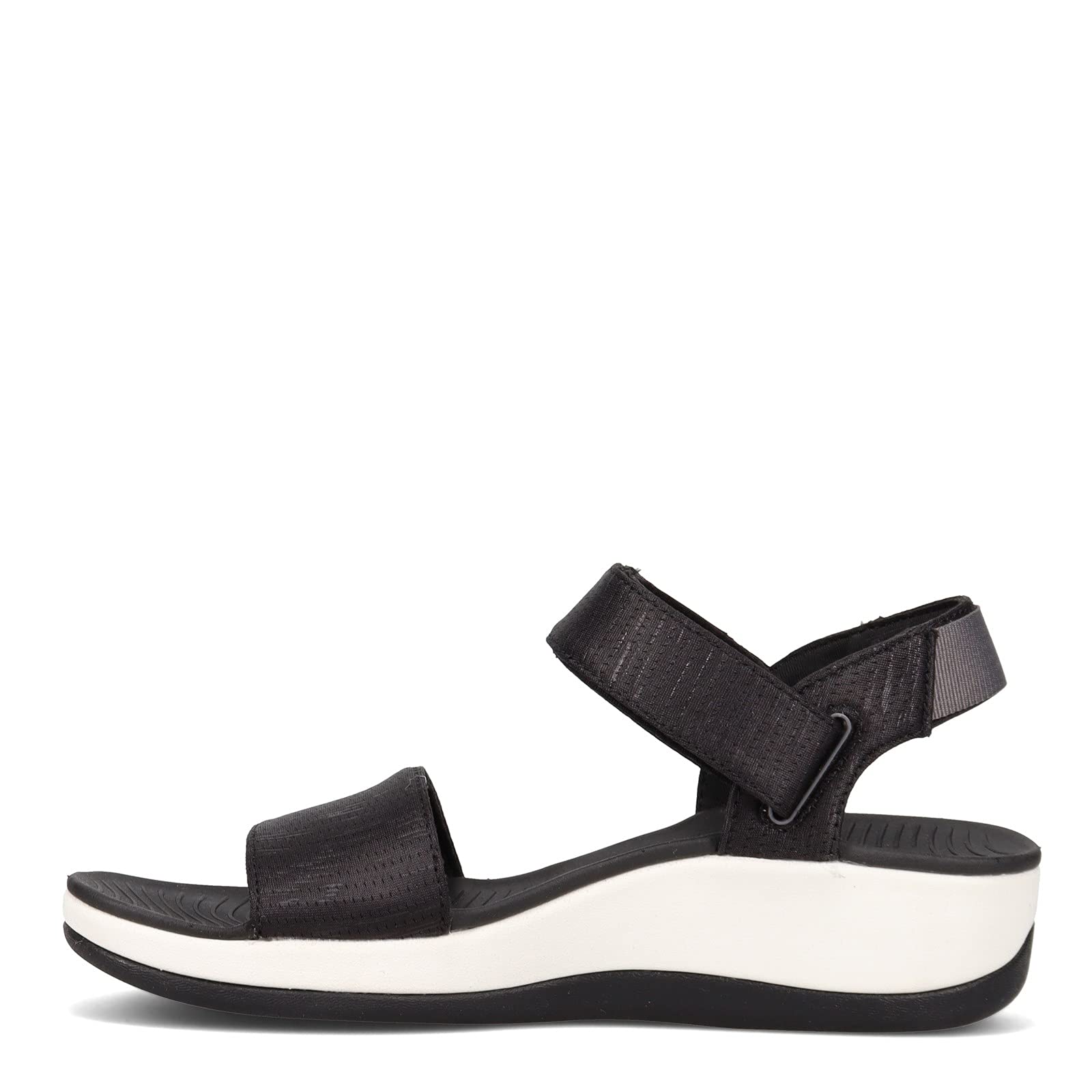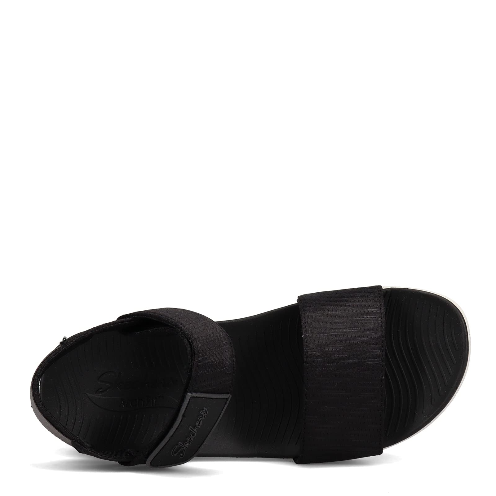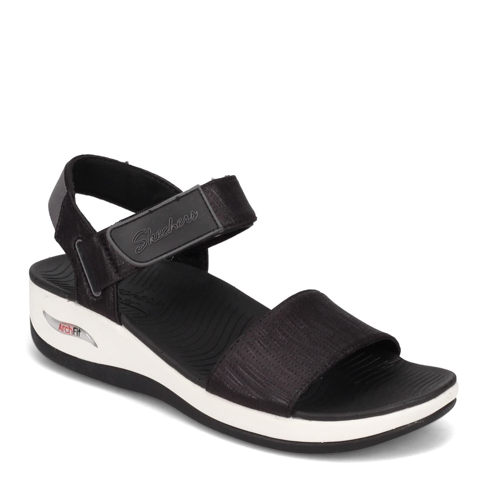 Appreciate the support and sunny style of the SKECHERS Arch Fit Sunshine - Quarter Strap. Endless adventures await in this super stylish sandal as it has materials that maximize comfort and give great support for all day wear. They pair well against outside elements so stride in confidence and style. Contoured footbed helps mold foot to reduce shock and increase weight dispersion. Front slide and ankle strap with adjustable hook-and-loop closure. Man-made insole, outsole, upper and lining. Flexible rubber traction outsole. Open round toe. Chunky heel. Logo details.