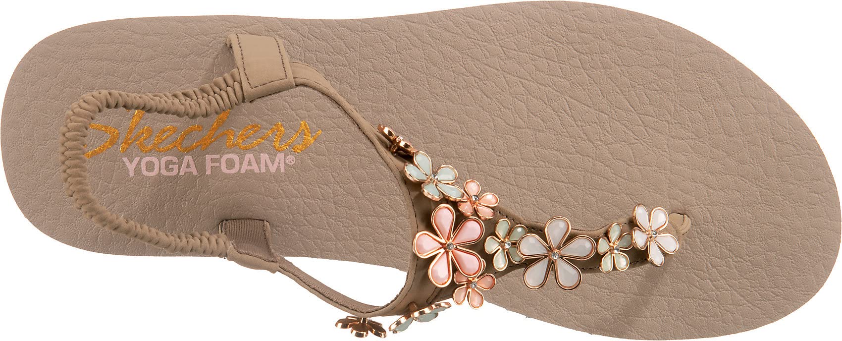 Add a touch of flower power to your warm weather look in Skechers Cali® Meditation - Glass Daisy. This casual thong style with stretchable slingback strap features a synthetic nubuck-textured upper with rhinestone and metal flower details, plus Yoga Foam comfort footbed.