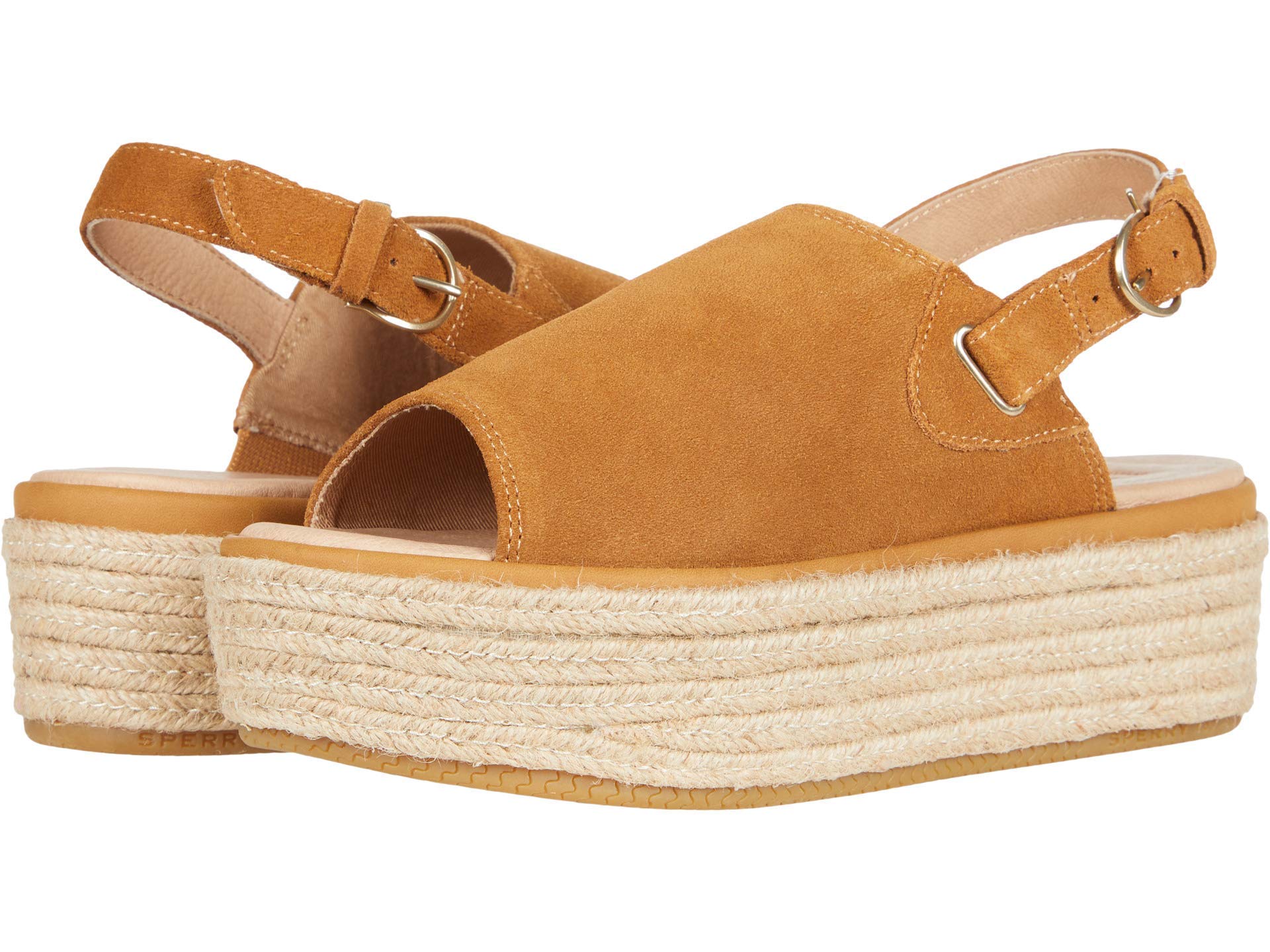 Elevate your look with the Sperry® Delmare Plushwave Flatform Sandals. This beautiful, bright platforms will make sure your feet are comfortable as well as stylish. The perfect summer accompaniment from day to night.Non-marking rubber outsole with Wave-Siping™ for the ultimate traction on both wet and dry surfaces.PLUSHWAVE technology provides extra cushioning and added bounce for better grip and rebound.Adjustable slingback strap with buckle fastening.Nubuck leather upper features broad closure across the vamp, with handstitched detailing.Soft leather lining for a comfortable wear.Open, round toe with platform heel.Espadrille rope detail around the midsole.Imported.Measurements: Heel Height: 2 1⁄2 in Weight: 14 oz Platform Height: 2 inProduct measurements were taken using size 8.5, width M (B). Please note that measurements may vary by size.Weight of footwear is based on a single item, not a pair.